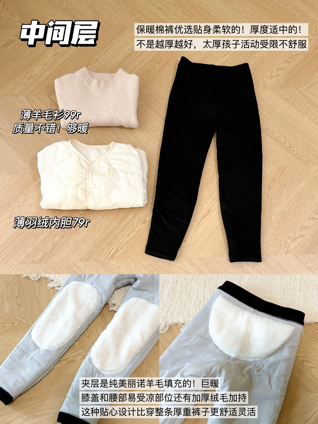 2️⃣ 中间层:上身羽绒内胆+薄羊毛衫,下身优选柔软贴身保暖棉裤,我这夹层是纯美丽诺羊毛填充的,膝盖和腰部易受凉部位还有加厚绒毛加持,这种贴心设计比穿整条厚重的裤子更灵活,活动不受限~