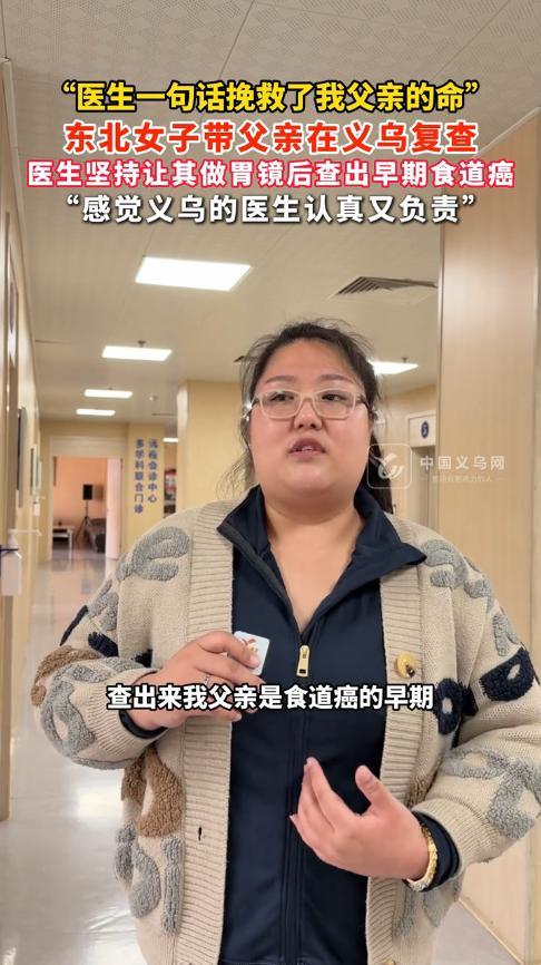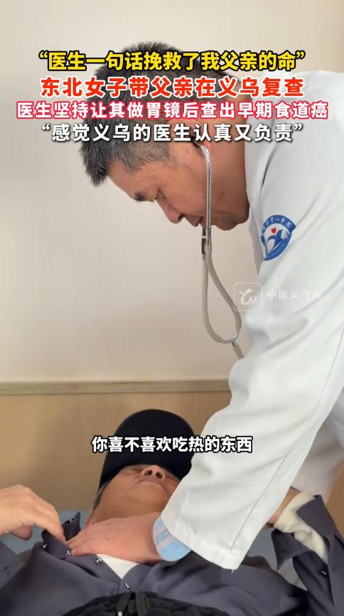 “这医生火了!”11月26日,浙江义乌,一东北老人来医院做肠镜,医生检查后,语重心长的询问他喜不喜欢吃热的东西,得到肯定的回答后,医生又让老人再去查一下胃,没想到,竟是食道癌早期!如果不是医生的坚持,老人的食道就要被全部切除。 癌症在早期的时候,基本上不会表现出症状来,所以很容易被人们忽视,等到身体出问题后,想要治疗就已经来不及了,所以大家还是定期体检比较好。 前不久,王女士和父亲在义乌这边做生意,由于父亲肠道不好,又到了复查的时间,二人就顺道来医院检查,黎医生接诊后,给老人做了详细的检查,并询问老人的日常饮食习惯。 在得知老人喜欢吃热的食物、喝热茶后,黎医生感觉事情没有表面那么简单,非常负责任的建议老人再去做一下胃镜。 就这样,王女士又带着父亲做了胃镜,没想到,结果和黎医生猜测的一样,老人这是食道癌!幸好还只是早期就被发现了,要是再晚两天,就没有这么简单了。 王女士得知后非常庆幸,远在他乡遇到了这么一位负责任的医生,在陪同父亲接受了治疗后,王女士制作了一面锦旗,送给黎医生以表谢意。 然而,黎医生却表示这没什么骄傲的,看病救人这是他们医生的本职工作,能看到病人恢复如初,这就是他最大的快乐! 网友看后表示后,这么尽职尽责的医生实在太难得了,现在去一趟医院,医生巴不得把所有的检查都给安排一遍,建议所有医生都向黎医生学习! 信息来源:《仁心仁术,敬职敬业!义乌医生一句话挽救患者生命》中国义乌网