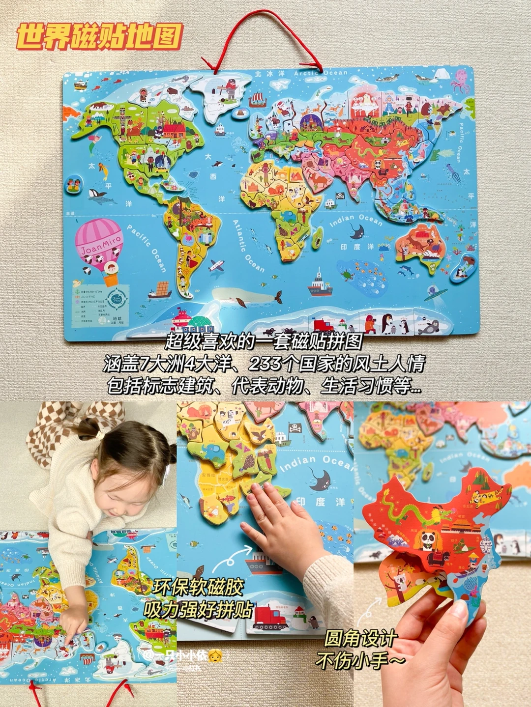 👉超级喜欢的一套磁贴拼图!涵盖7大洲4大洋、233个国家的风土人情~比较考验家长的地理知识,不过拼图上会有一些标志建筑、代表动物、风俗习惯的卡通提示,帮助宝宝认识全世界的风土人情~软磁铁吸力不错,圆角设计不伤手!