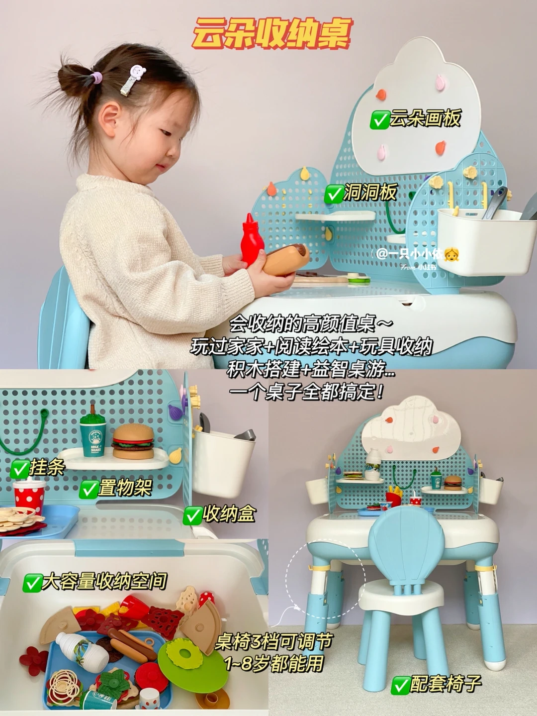 👉收纳能力超强的高颜值桌子~云朵造型好戳我!玩过家家+读绘本+玩具收纳+积木搭建+益智桌游都🉑️!自带的置物架、挂条、收纳盒可以收纳宝宝玩具,节省空间;而且桌腿能调节,大宝小宝都能用!