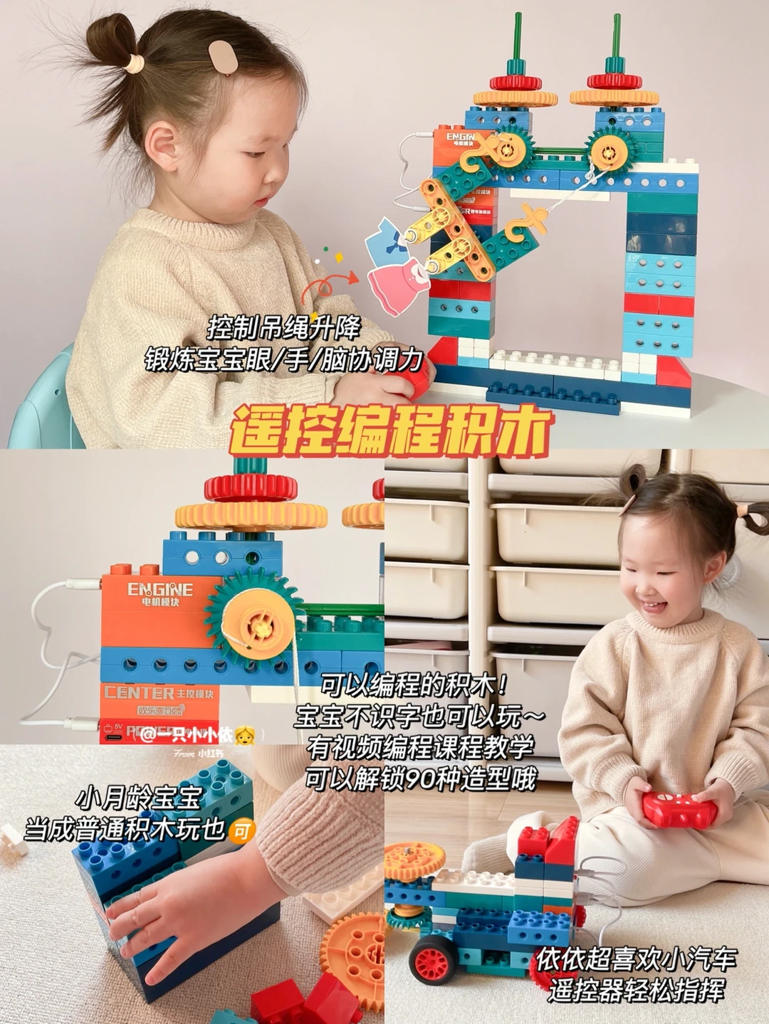 👉玩腻了普通积木,可以试试遥控编程积木哦~我本来以为会很难,还好有清晰易懂的视频教学和教程书,很快就上手了,就算宝宝不识字也能玩哦~依依超喜欢小汽车和晾衣杆这两个电动造型,遥控指挥很有趣!一共有90种造型,每天解锁一种都能玩3个月