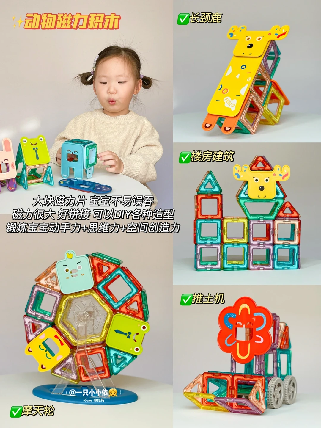 👉磁力片真的是玩不腻系列,一玩就是大半天~大块磁力片适合宝宝抓握,不容易误吞;磁力也很大,拼接不费力,送了很多卡通动物片和车轮、摩天轮等配件,可以和宝宝一起DIY各种隐藏玩法,动物/汽车/摩天轮/建筑物等,锻炼动手能力、想象力和思维创造力~