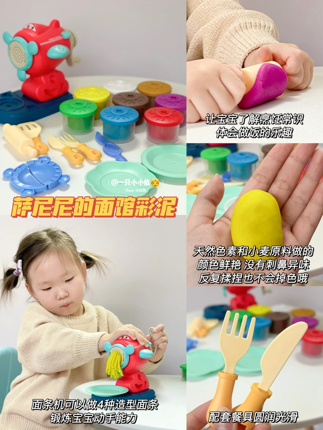 一共有12罐彩泥,还有超多题卡,引导宝宝捏出各种造型。彩泥不粘手、没有异味,是用小麦做的,反复揉捏也不会掉色。