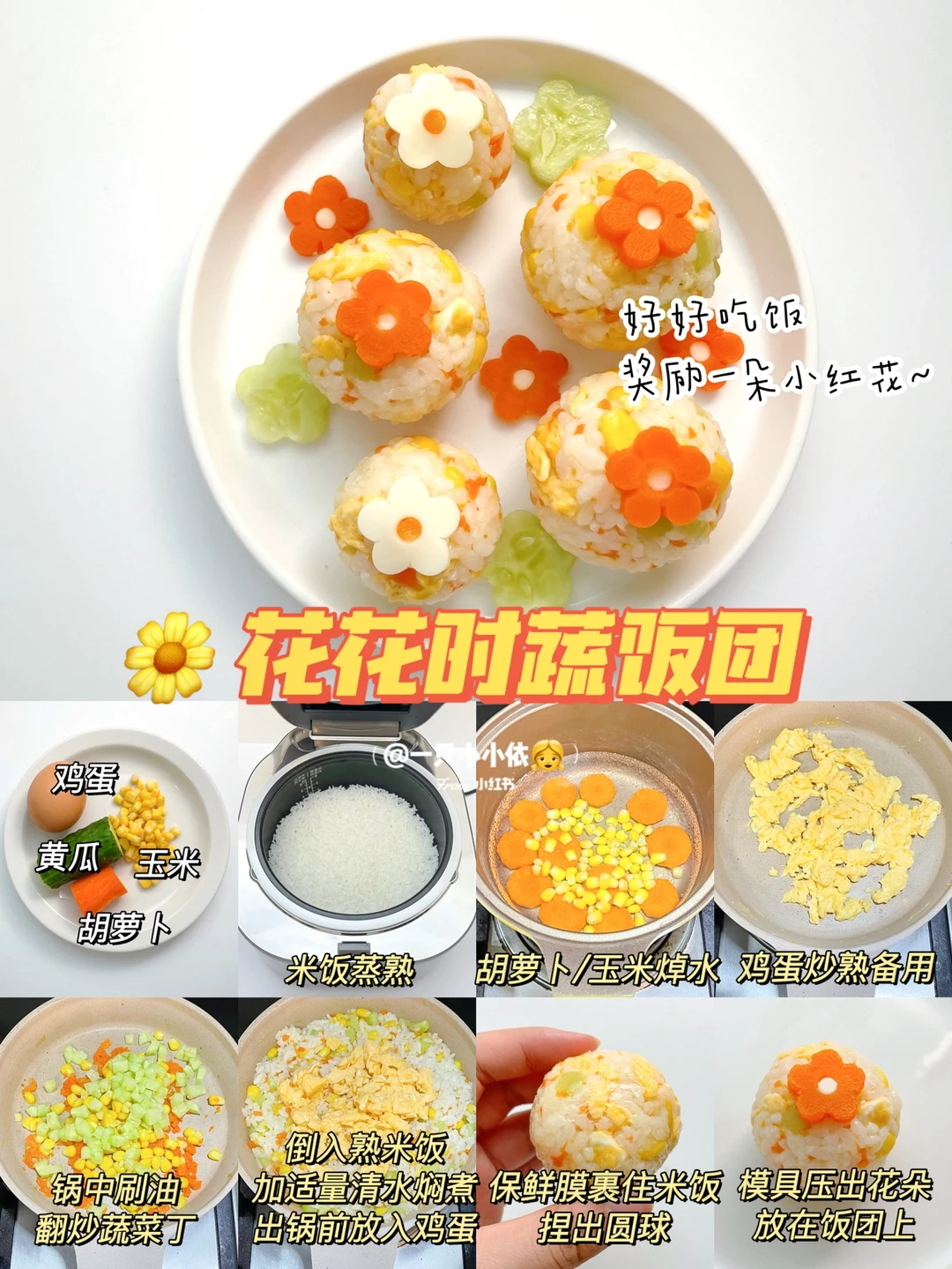 🔸步骤:米饭蒸熟,胡萝卜、玉米焯水,鸡蛋炒熟备用;锅中刷油,翻炒蔬菜丁,倒入熟米饭并加适量清水焖煮,出锅前放入炒熟的鸡蛋;用保鲜膜裹住米饭捏出圆球,压出花朵放在饭团上