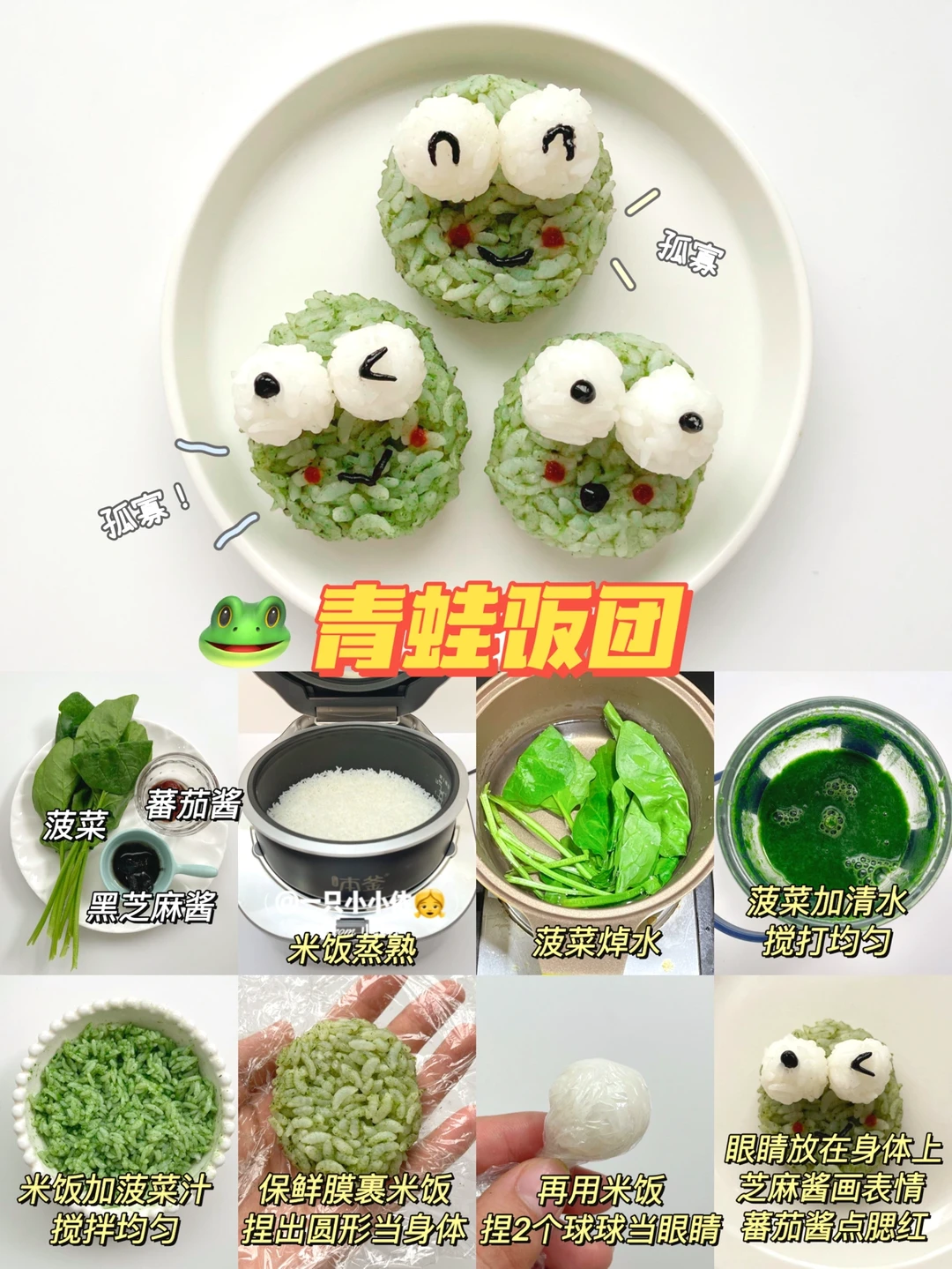 🔸步骤:米饭蒸熟,菠菜焯水后加清水打匀,米饭加菠菜汁搅拌均匀;用保鲜膜裹米饭并捏出圆形当身体,再用米饭捏两个球球当眼睛放在身体上,芝麻酱画表情,番茄酱点腮红✅