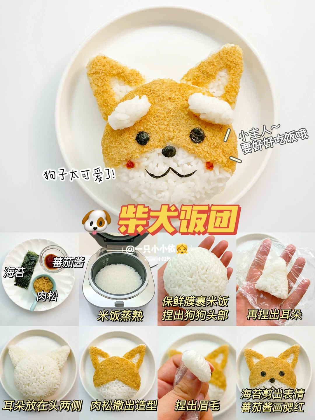 🔸步骤:米饭蒸熟,保鲜膜裹住米饭捏出狗狗头部,再捏出耳朵、眉毛,把耳朵放在头两侧,肉松撒出造型,海苔剪出表情,番茄酱画腮红✅