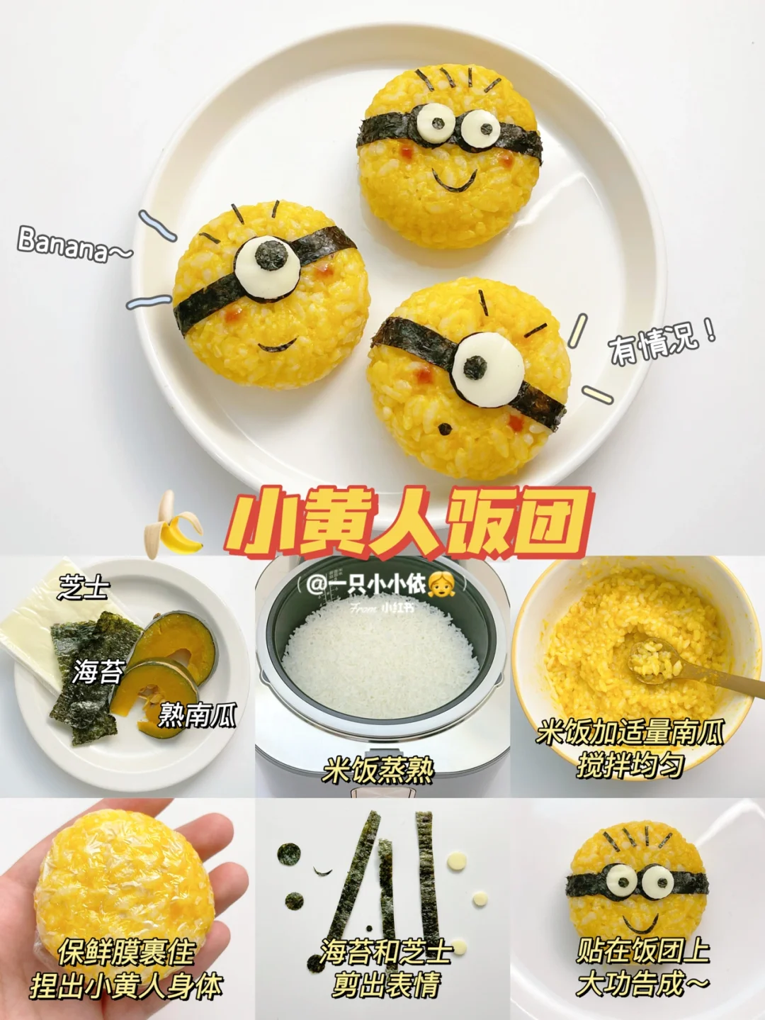 🔸步骤:米饭蒸熟,加入适量南瓜搅拌均匀,保鲜膜裹住米饭捏出小黄人身体,用海苔和芝士剪出表情,贴在饭团上✅