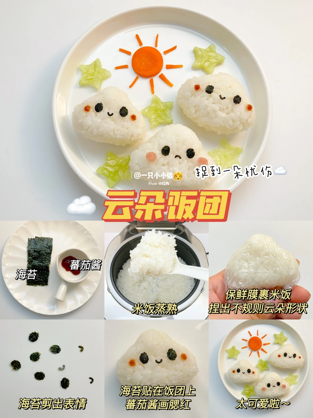 🔸步骤:米饭蒸熟,保鲜膜裹住米饭后捏出不规则云朵形状,海苔剪出表情后贴在饭团上,番茄酱画腮红✅