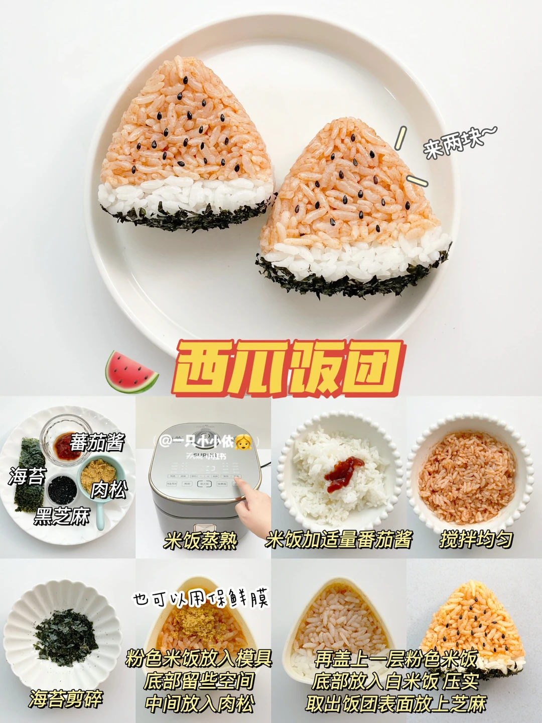 🔸步骤:米饭蒸熟,加适量番茄酱搅拌均匀;海苔剪碎,粉色米饭放入模具,让底部留些空间,上面放入肉松后再盖上一层粉色米饭,底部放入白米饭压实;取出饭团,表面放上芝麻即可