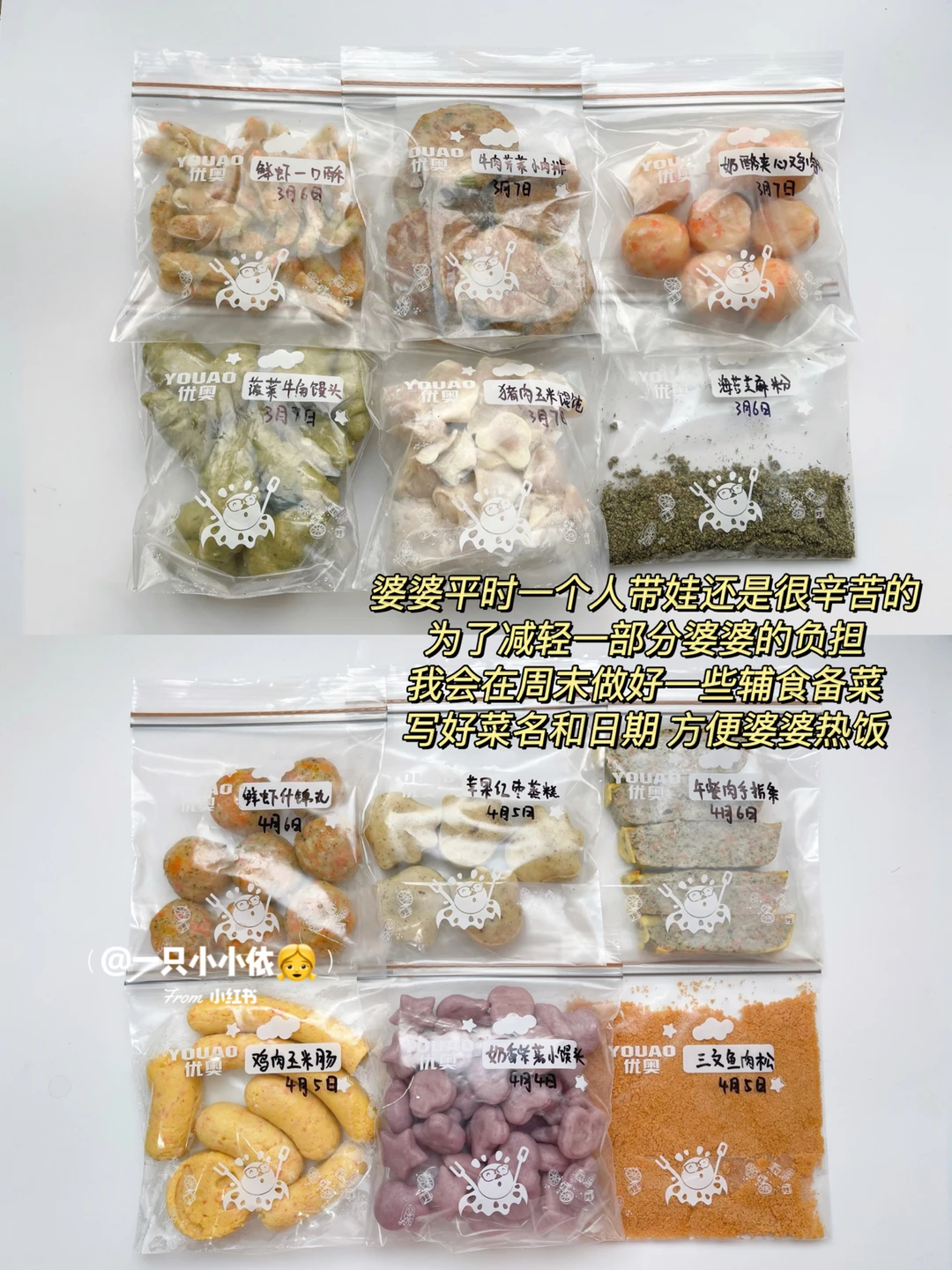 👉我周末也会帮忙准备部分辅食,比如馒头、肉饼、肉丸子这些易保存的食物,写好日期和菜名,方便婆婆热饭