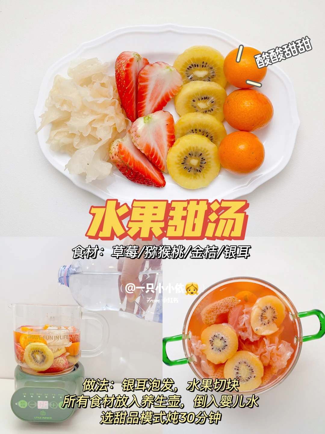 ✨7月龄到1岁间的宝宝喝汤、或打成泥食用(软嫩的水果可以小口吃);1岁以上的宝宝可以果肉和汤一起吃;