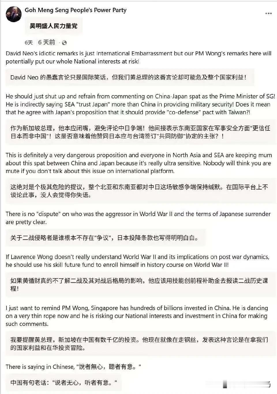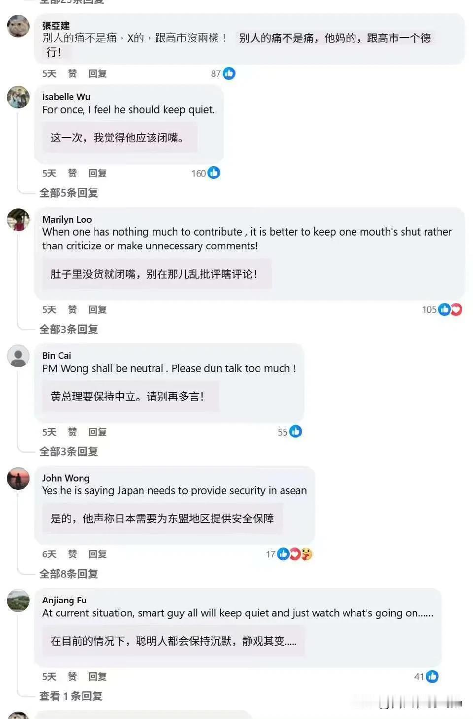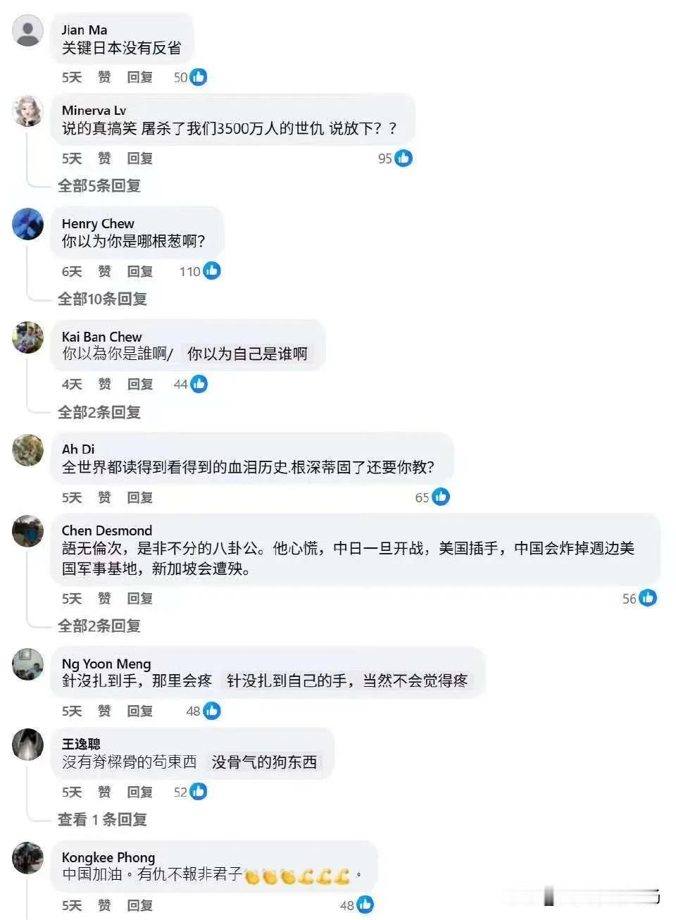 新加坡总理帮腔日本,让中国“大度点”,遭国民怒喷:老实蹲角落里闭嘴! 中日闹僵后,有眼色的国家都纷纷表态,称坚持一个中国原则,再不济,也都是保持中立,谨言慎行,生怕卷入风波。然而,新加坡总理黄循财却跳出来拉偏架,帮腔日本。 对着中国喊话“大度点”,呼吁搁置历史与日本和解,这番不分是非的言论不仅引发国际社会热议,更遭到新加坡国民的集体怒喷,直言让他“老实蹲在角落里闭嘴”。 11月19日,黄循财在彭博创新经济论坛晚宴上与媒体对话时,主动谈及中日紧张局势。他既不评判日本首相高市早苗的挑衅言行是否妥当,反而以东南亚“经验”为由,劝说中方放下历史成见,与日本“共存并进”。 更令人匪夷所思的是,他竟宣称民调显示日本是“东南亚最受信任的大国”,还表示新加坡及其他东南亚国家支持日本在区域安全领域扮演更重要角色。这番话彻底刺痛了不少人的神经。 谁能忘记,当年日军曾占领新加坡三年多,制造了惨无人道的“新加坡大屠杀”,无数平民死于屠刀之下,这段屈辱历史是新加坡民族记忆中难以磨灭的伤疤。 如今身为国家总理的黄循财,却对侵略者既往不咎,甚至将其捧为“最受信任的大国”,这般颠倒黑白的表态,难怪会引发公愤。新加坡民众的愤怒几乎是瞬间爆发,网络上满是对黄循财的批评与指责。 素来注重国家及领导人国际形象的新加坡人,本就因国土狭小而格外谨慎对待外交表态,如今看到自家总理如此“失言”,自然无法容忍。理性的民众直言黄循财“失语了”,认为在中日矛盾的敏感时刻,新加坡最该做的是保持缄默,而非贸然站队。 心直口快者则毫不留情,怒斥其“你算哪根葱”“肚子里没货就别瞎评论”,更有人痛批他是“是非不分的八卦公”。有网友给出的比喻十分形象:“当两只大象打架时,最好站在旁边避免被踩”,点出了新加坡作为小国应有的外交智慧。 对比新加坡“国父”李光耀,黄循财的政治能力与智慧更是相形见绌。李光耀在位期间,即便咖位远超如今的黄循财,在谈及台湾问题或评价日本时,始终与中方保持高度默契,既坚守一中原则,又能妥善处理历史与现实的关系,从未出现过如此出格的言论。 而黄循财上任总理才一年多,便急于在国际舞台上“出头”,结果因缺乏对历史的敬畏、对局势的清醒判断而说错话、办错事,暴露了其外交经验的匮乏与战略眼光的短浅。作为小国领导人,本该深谙“小国寡民”的生存之道,在大国博弈中保持中立、谨言慎行。 黄循财却反其道而行之,主动卷入敏感争端,不仅没能为新加坡争取任何利益,反而让国家陷入尴尬境地。黄循财的不当表态,自然也引起了中国的关注,中方给出的回应既含蓄又有力。 11月25日,中方驻日使馆发布了一组历史图片,聚焦于侵华日军的一支病毒实验部队,文案特别点明该部队的总部设立在新加坡,分支更是遍布东南亚。这一特殊回应堪称“一语双关”,既像是温柔的提醒:新加坡也曾遭受日军的奴役与残害,不该忘记那段屈辱的历史。 新加坡曾是侵华日军作恶的“大本营”之一,如今在中日问题上发表言论,更应谨言慎行,而非不分是非地要求受害者“大度”。中方的回应没有激烈的言辞,却以历史事实为依据,让黄循财的言论不攻自破,也让国际社会看清了谁在真正尊重历史、谁在刻意歪曲是非。 黄循财或许辩称自己的初衷是希望区域稳定,但真正的稳定绝非建立在让受害者“遗忘历史、忍气吞声”之上。历史是最好的教科书,日本当年的侵略行径给包括中国、新加坡在内的亚洲各国人民带来了深重灾难,这份伤痛需要被铭记,更需要日本拿出真正的诚意道歉、反思,而非试图淡化、掩盖。 作为东南亚国家,新加坡本应深知历史对地区关系的重要性。当年日军的铁蹄踏遍东南亚,各国都曾遭受磨难,这份共同的历史记忆本应是促进区域国家相互理解、警惕战争的纽带,而非被轻易“搁置”的无关紧要之事。 黄循财将日本称为“东南亚最受信任的大国”,或许是出于现实利益的考量,但忽视历史、讨好侵略者的做法,终究难以服众。 一个国家的信任,从来不是靠刻意讨好得来的,而是建立在尊重历史、坚守正义、互利共赢的基础之上,日本若想真正获得亚洲各国的信任,首先要做的是正视历史、深刻反思,而非靠他国领导人的“背书”。 小国的生存之道,从来不是依附某一方、随意站队,而是在尊重历史、坚守正义的基础上,维护自身的独立与尊严。黄循财的言论不仅让自己陷入舆论漩涡,更让新加坡的国际形象受损,这样的教训值得深思。 历史不容遗忘,正义不容亵渎。中国历来主张以史为鉴、面向未来,但这一切的前提是日本能够正视历史、真诚道歉。黄循财要求中国“大度”的言论,本质上是对历史正义的漠视,对受害者情感的伤害。