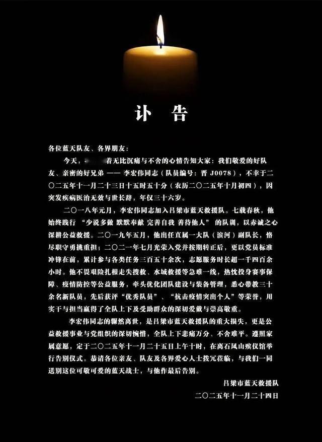 吕梁蓝天救援队队员李宏伟去世, 年仅 36 岁,志愿服务 1400 小时 36岁的蓝天救援队员李宏伟意外离开了我们,这个消息传来,好多人心里都特别难受。这位才36岁的年轻英雄,在过去7年里,光救援任务就参加了350多回,光志愿服务加起来也超过了1400个小时。 23号下午的时候,李宏伟突然生了急病,送医院抢救了半天也没救回来,就这么走了。队友们说起他,眼睛都红了——每次走失的人找不到,或者水里出事需要救援,他总是第一个往前冲,这些年还带过30多个刚入队的新队员,手把手教他们本事。北京的队友看到他的讣告,眼泪都快掉下来了,哽咽着说:“这么好的救援人,怎么说没就没了啊……” 吕梁的队友们也都在网上发了帖子悼念,有人写:“之前还说好了要一起喝顿酒的,怎么就再也回不来了呢?”还有人说:“你总跟我们说‘救援的时候一定注意安全’,现在你却……”25号早上,当地的殡仪馆里人特别多,都来给他送行,办了个告别仪式。 1400多个小时的时间都在做志愿救援,350多次在生死边缘救人,李宏伟用自己这不算长的一辈子,写出了最动人的爱。咱们都得把这个平民英雄记在心里,希望他在天上不用再面对那些危险的事儿,英雄,你慢慢走,我们会想你的! 这样的普通人,却做着不普通的事,这样的英雄真该永远记着。那在你身边,有没有像他一样,默默为别人付出的普通人呢? -search.byteimg.com/img/tos-cn-i-tjoges91tu/T3PXGyC1BsX3pO~480x480.jpeg