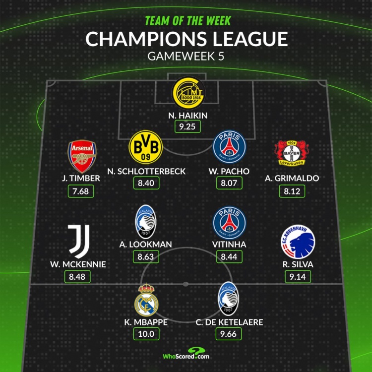 直播吧11月27日讯WhoScored根据球员的评分列出欧冠第5轮最佳阵容,姆巴佩领衔。