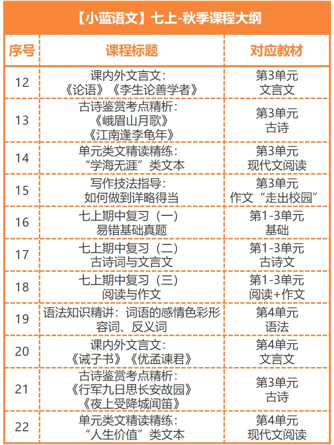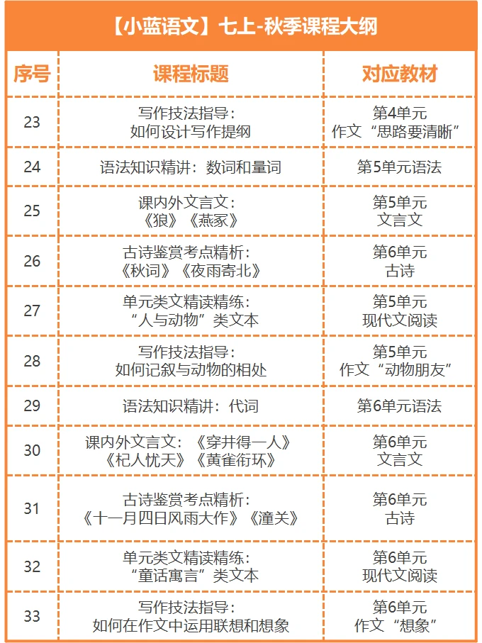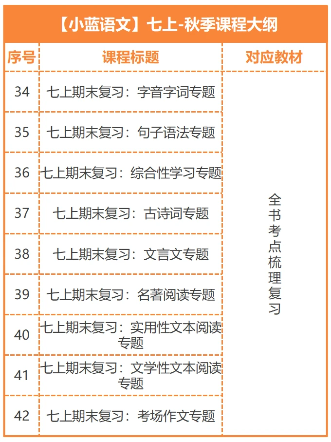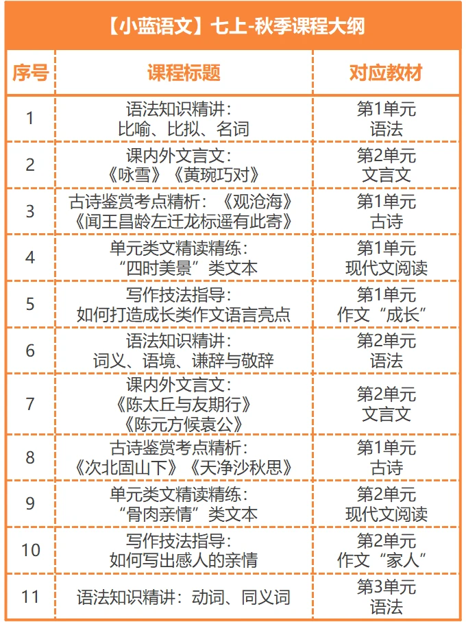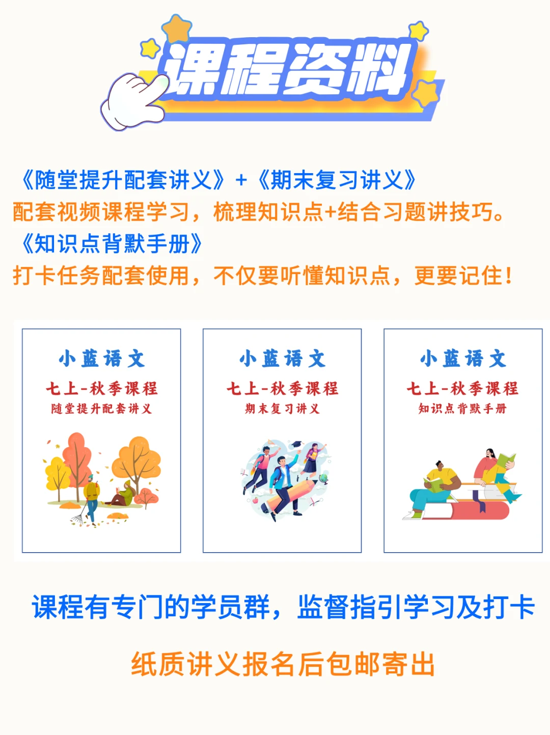 七上语文如何高效学习? 42讲+5项服务+3本讲义,小蓝老师陪跑一整学期[耶R] 七上秋季语文陪跑分为3条线: 第[一R]条线是【视频课程】 讲清基础、古诗文、名著、阅读、作文每个板块的重难点知识,还包含期中和期末两项专题复习。 第[二R]条线是【背默打卡】 在理解中扎实记忆,完成本学期语文学习的所有必背板块。 第[三R]条线是【课后服务】 试卷分析+作文批改+监督打卡+答疑指导+专属资料 三线并行,高效学习[派对R]