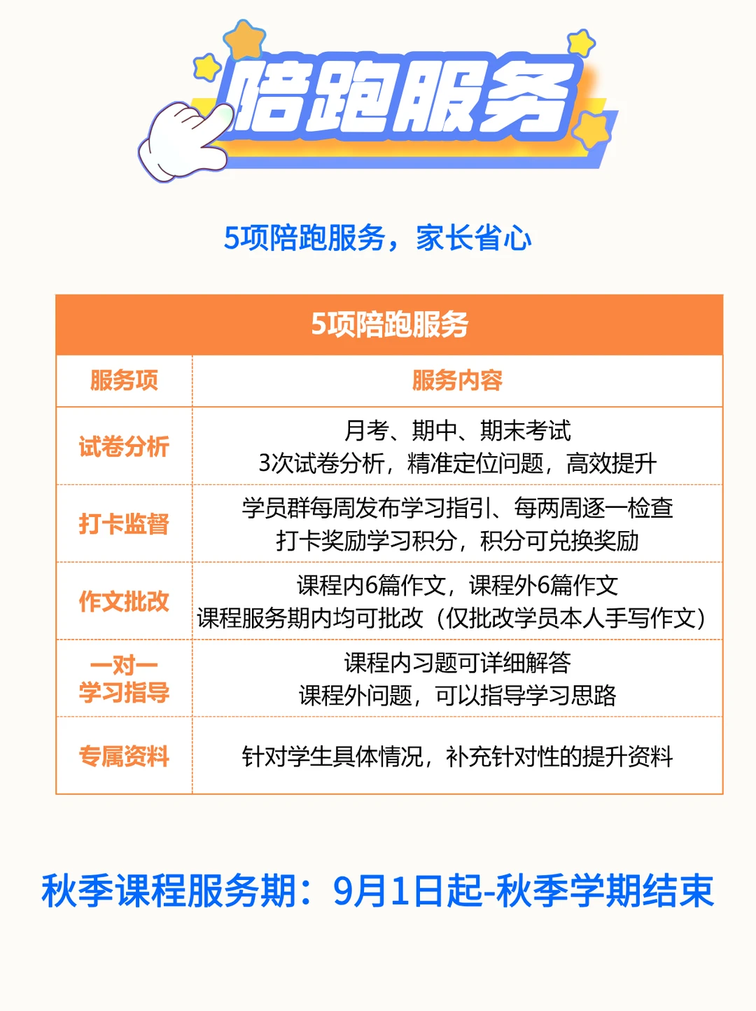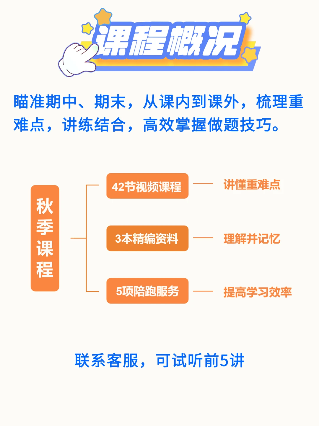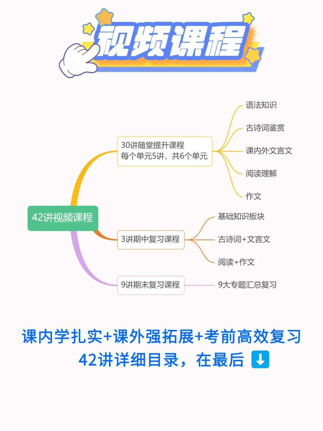 七上语文如何高效学习? 42讲+5项服务+3本讲义,小蓝老师陪跑一整学期[耶R] 七上秋季语文陪跑分为3条线: 第[一R]条线是【视频课程】 讲清基础、古诗文、名著、阅读、作文每个板块的重难点知识,还包含期中和期末两项专题复习。 第[二R]条线是【背默打卡】 在理解中扎实记忆,完成本学期语文学习的所有必背板块。 第[三R]条线是【课后服务】 试卷分析+作文批改+监督打卡+答疑指导+专属资料 三线并行,高效学习[派对R]