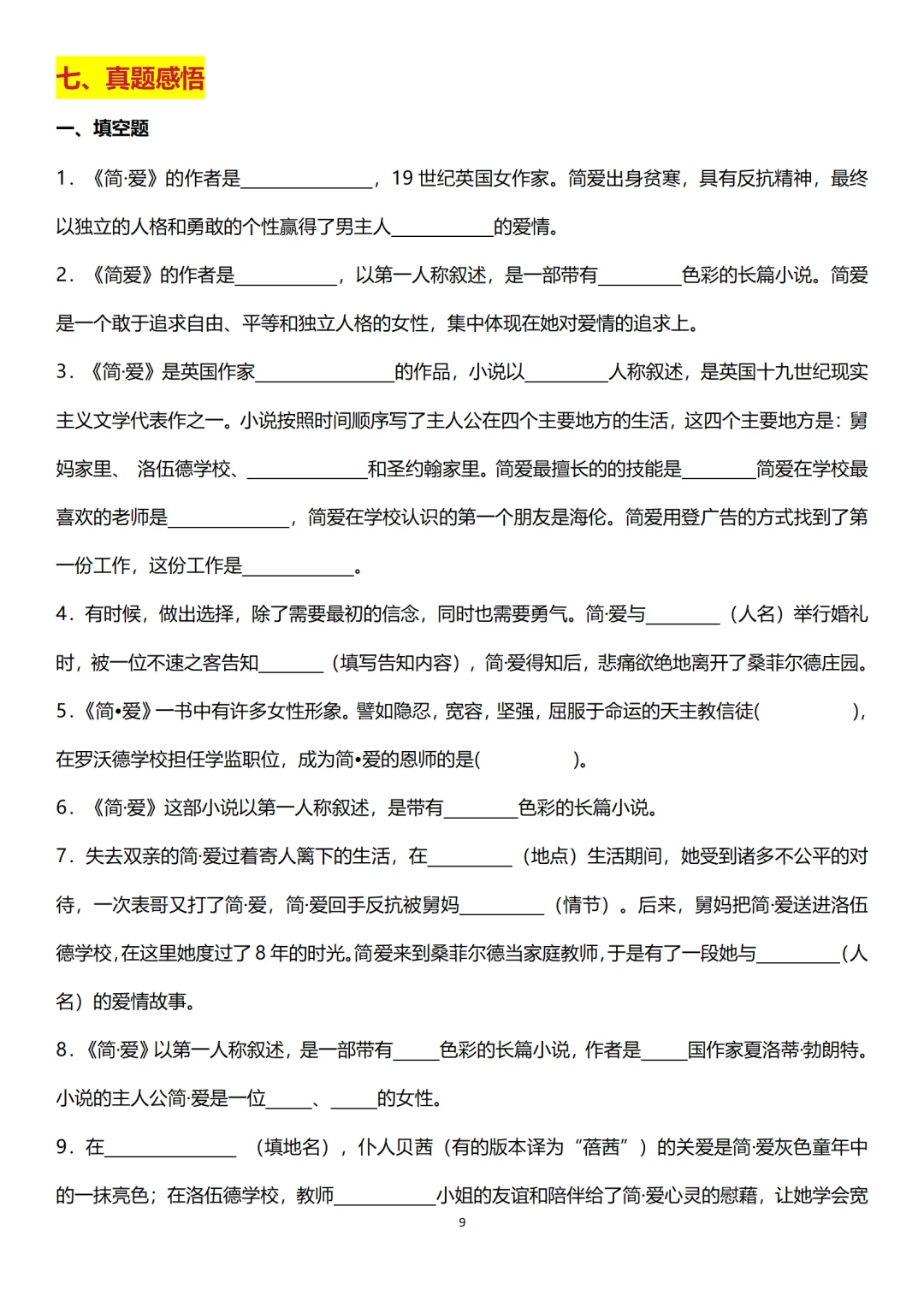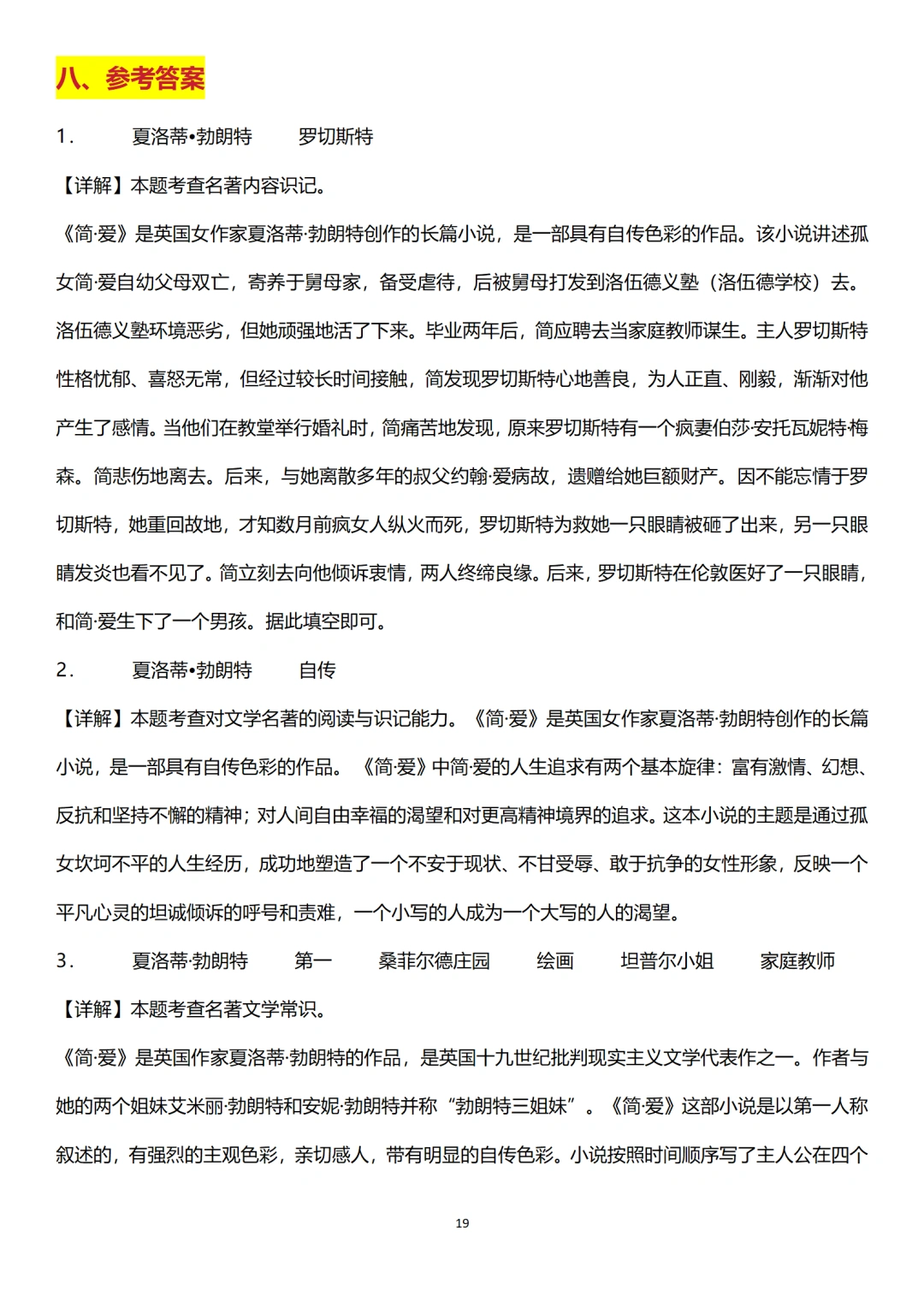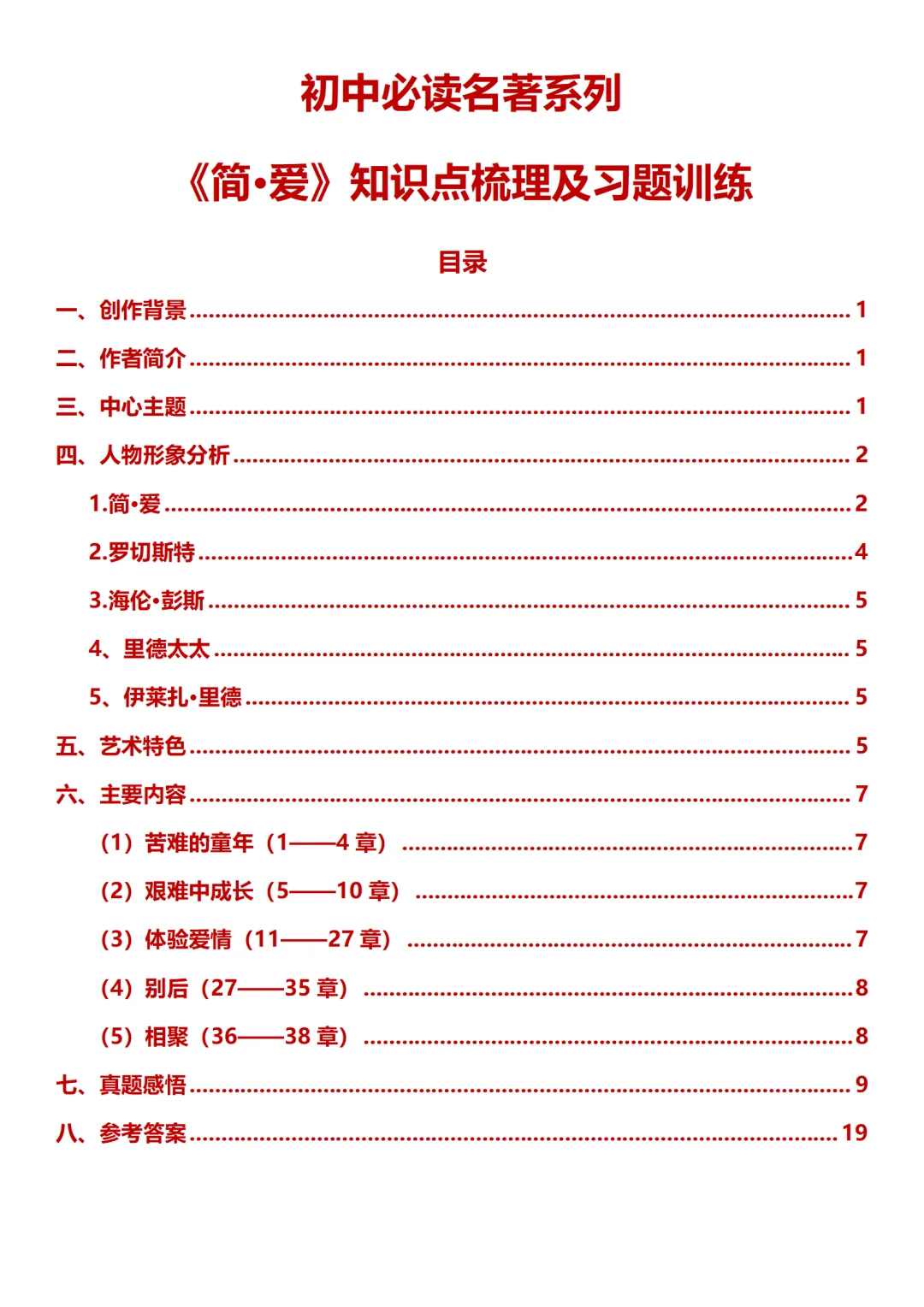 老师在这里整理了初中《简·爱》的常考知识点和必练真题: