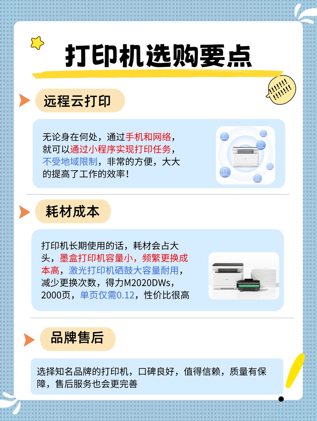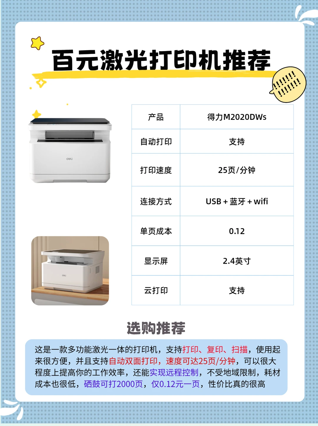 打印机长期使用的话,耗材会比较占大头,墨盒打印机容量小,频繁更换成本高,激光打印机硒鼓大容量耐用🤩🤩,得力M2020DWs的硒鼓耐用2000页✨,单页仅需0.12元,性价比真的很高