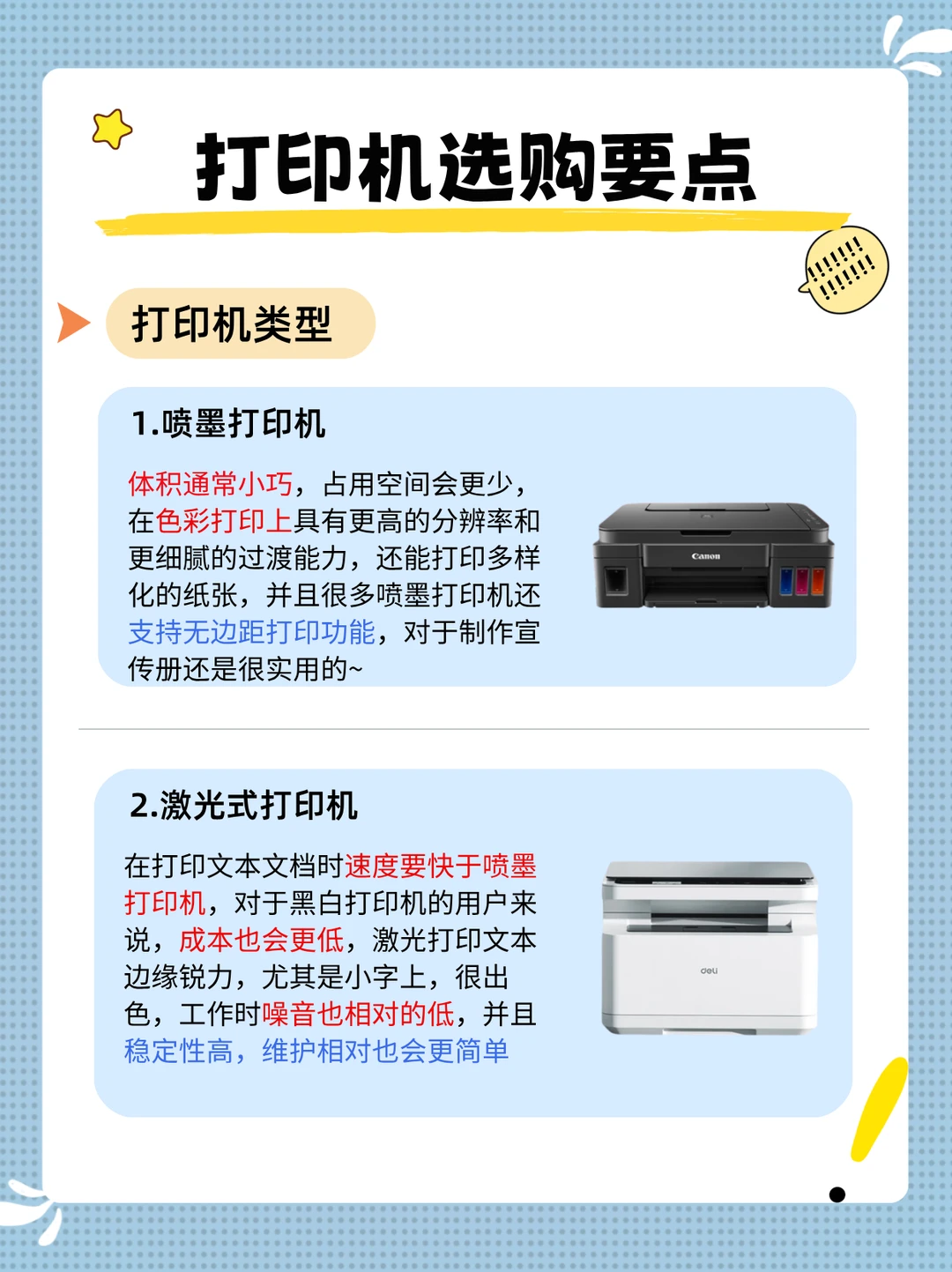 通常体积比较小,不容易占空间✨, 在色彩打印上有着很不错的分辨率,但喷头容易堵塞,打印速度慢