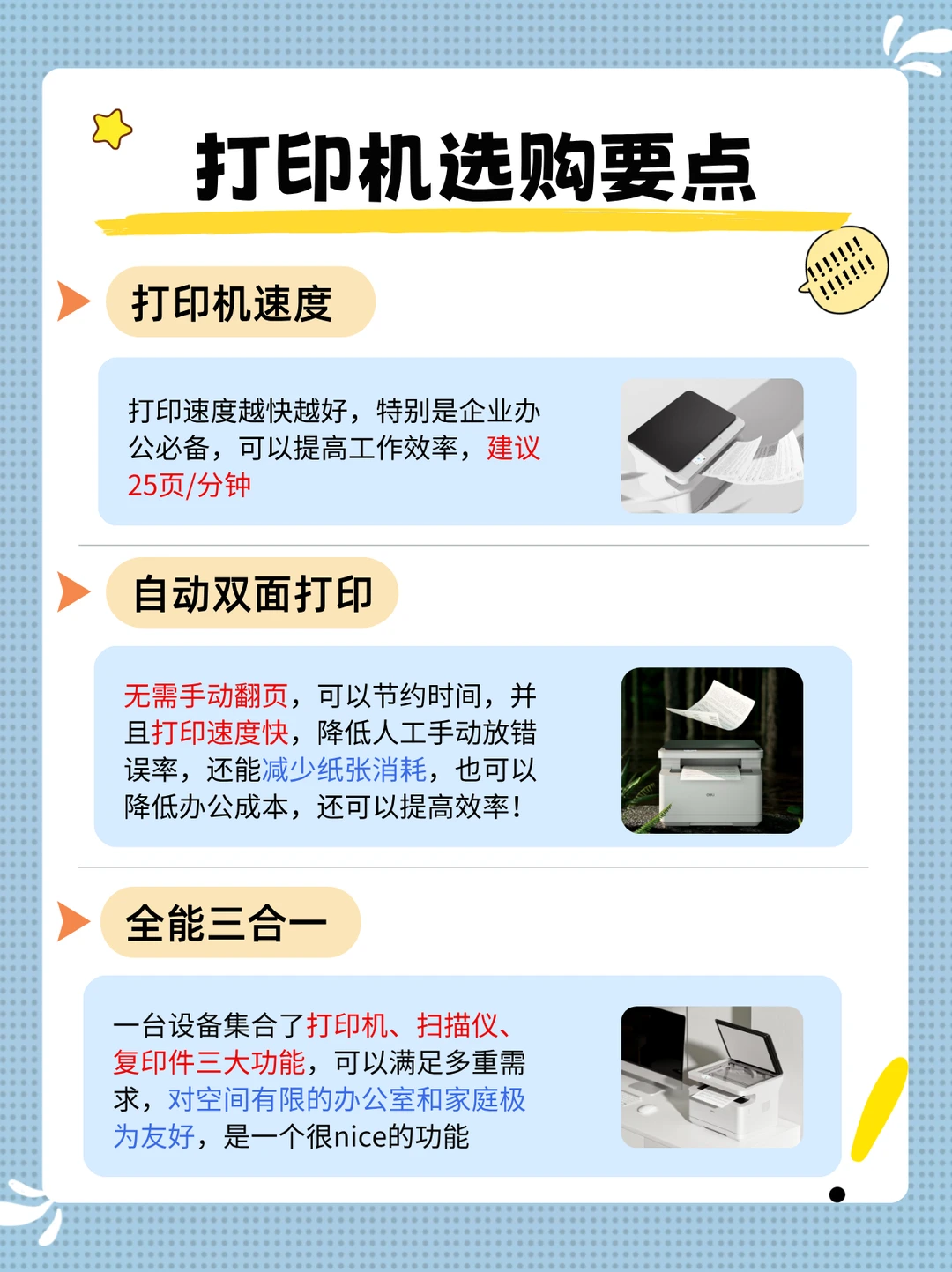 这是一款多功能的激光打印机,可以实现三合一的功能✨,支持打印、复印、扫描,非常的方便,并且不占位置 ,平常使用时蓝牙连接也很快,仅需40秒😘😘,而且还支持自动双面打印[赞R][赞R],速度可达25页每分钟,还能实现远程控制,小程序就能直接操作,不受地域限制[哇R][派对R],并且耗材成本也很低,仅0.12元一页,👉很适合有孩家庭和小型企业,需要频繁打印资料的伙伴!
