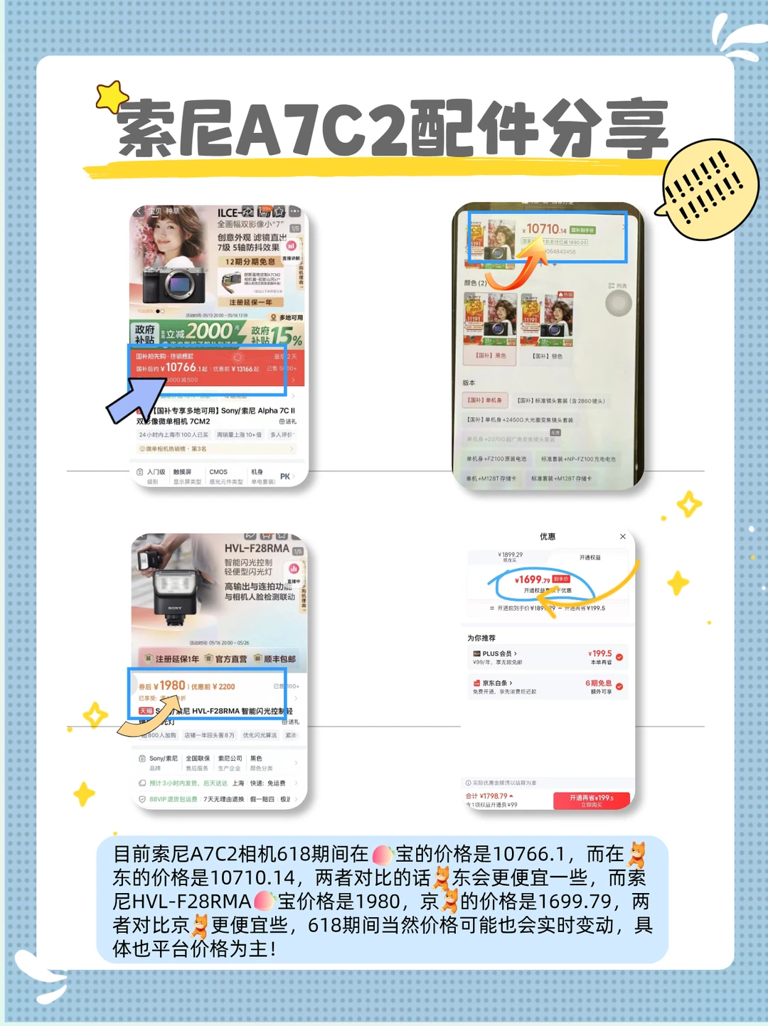 目前618期间,现在在🍑 宝入手索尼A7C2价格是10766.1,在🐶 东的价格是10710.14,搭配一个索尼HVL-F28MA闪光灯,轻松拍出闪光灯大片 !