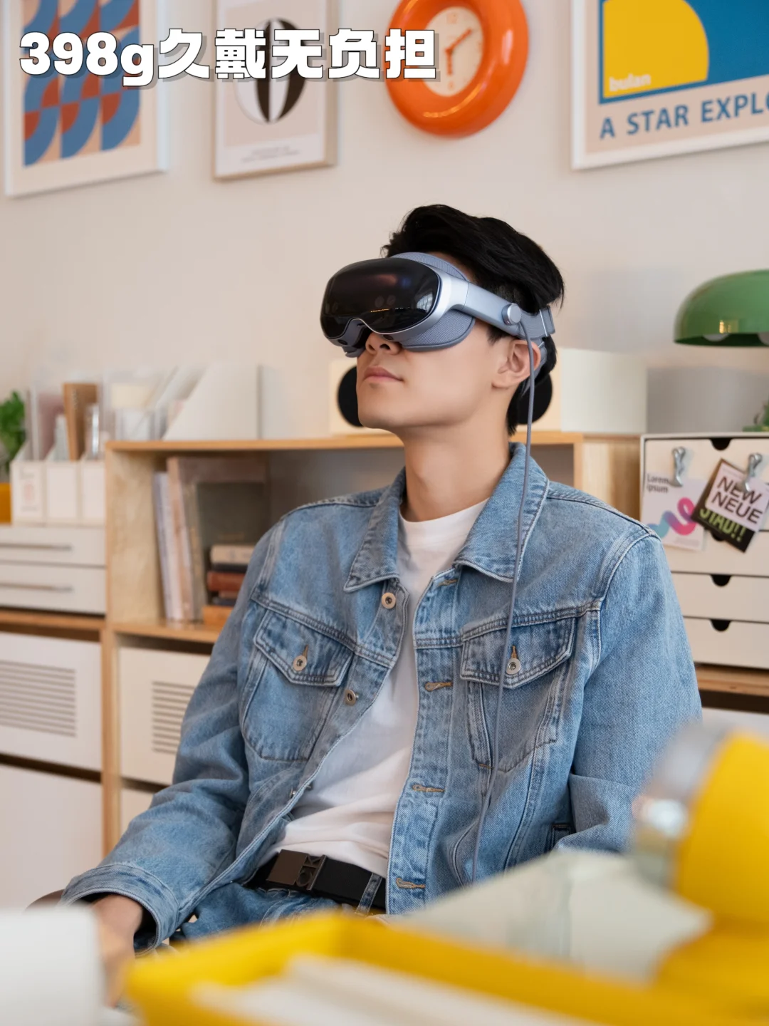 机身只有398g!戴起来根本不像传统VR设备那样压脸+闷汗~ 👉光影层次感前壳 + 超纤材质,质感拉满还不显笨重 挤地铁、泡咖啡馆,别人还以为你戴的是潮流墨镜😎