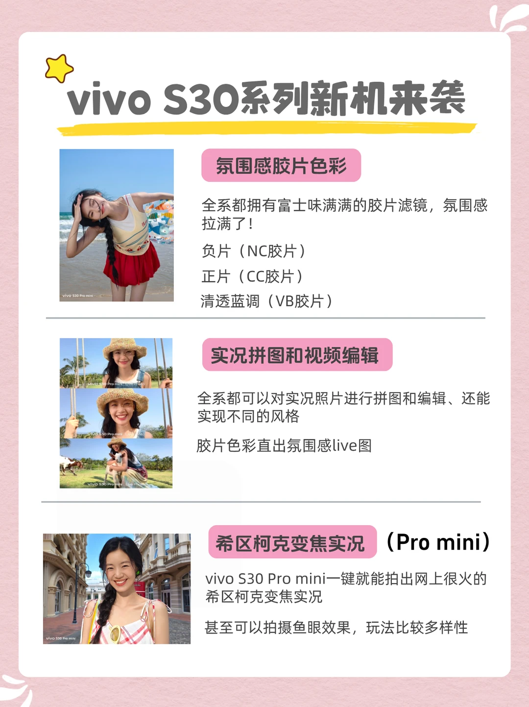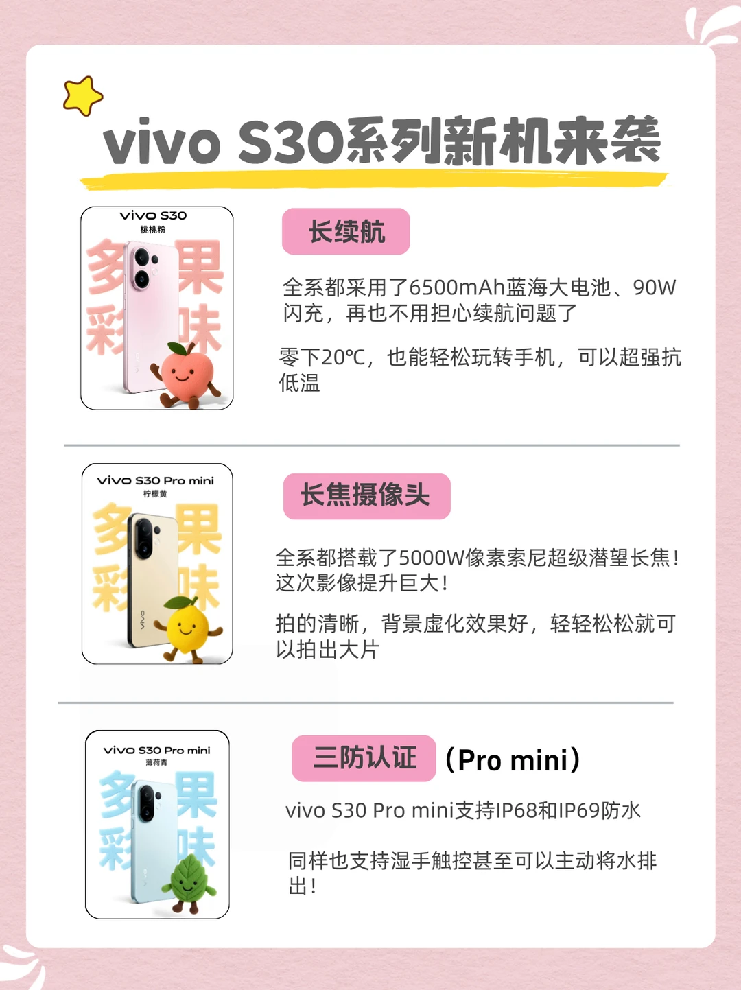 vivo S30系列全系都是多巴胺配色,💗桃桃粉、💙薄荷青、💛柠檬黄 、🖤可可黑、🎀酷莓粉,拿在手上很有夏天的感觉,显得青春活泼!
