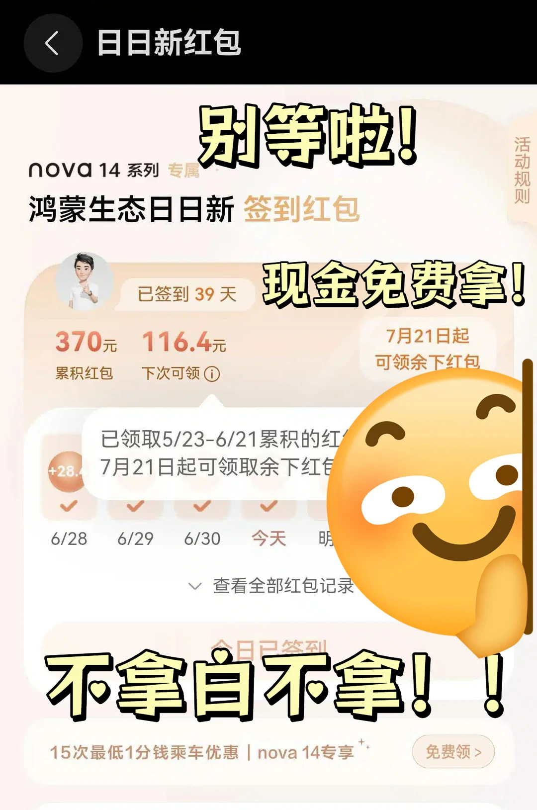 鸿蒙红包就像 “每日小惊喜”,每天签到 30 天提现到华为支付,我现在已经攒了180多元[暗中观察R][暗中观察R],打算下个月给妈妈买个小礼物,每天努力攒钱买的礼物都感觉很珍贵呢~