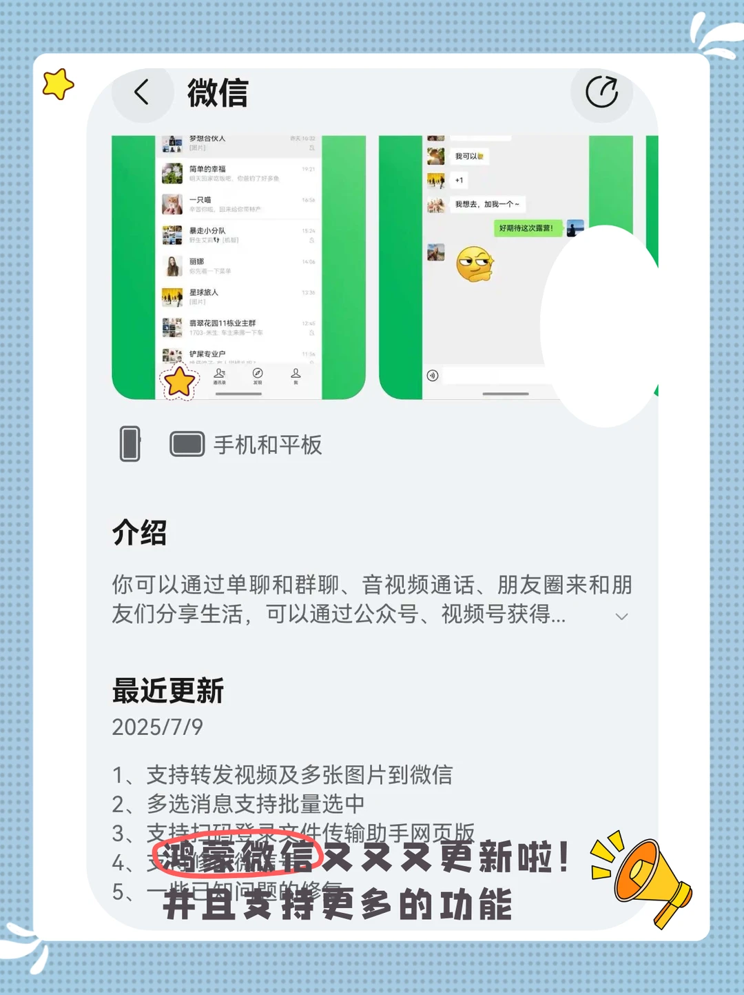 功能上更是用了就离不开😍🤨,以前打开别的软件一下给我跳转到别的软件,真的是猝不及防!现在所有人都去打开这个功能,直接解决这个问题!!😝😝微信更新后居然可以扫码登录文件传输助手网页版,在教学楼的电脑上没有微信,但是我的ppt在手机上,心想完蛋啦!🌚🌚但是尝试了一下在网页上登陆了微信传输助手没想到一下子直接传到电脑上了,救我一命[派对R][派对R],快去华为应用市场下载体验~