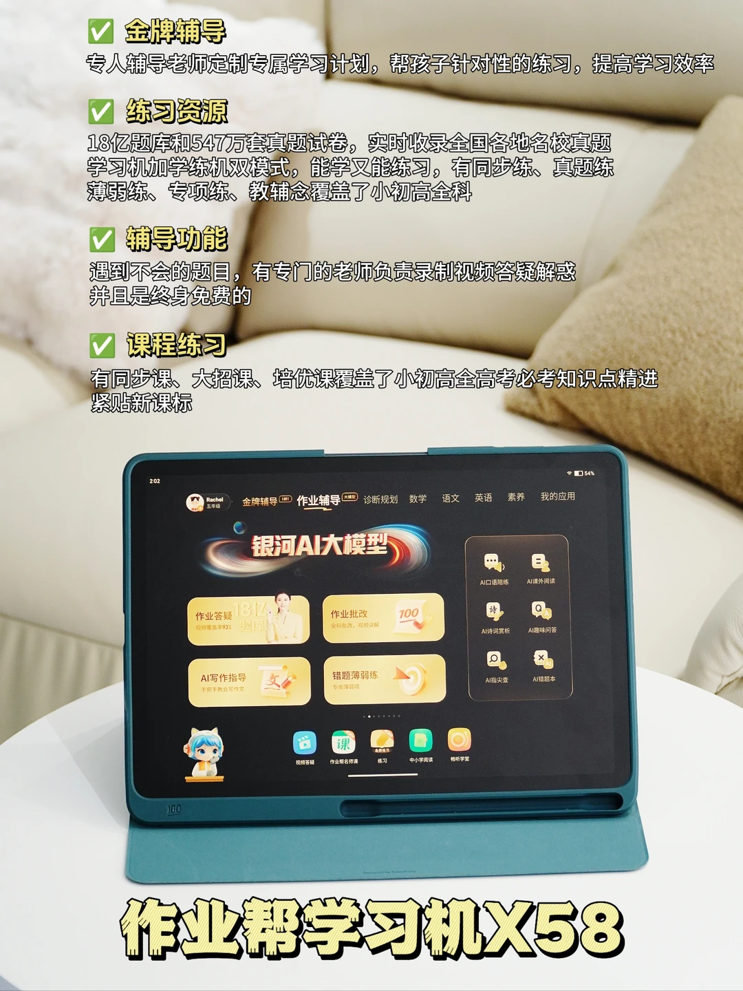 作业帮X58:14.3英寸巨幕类纸屏,2.4K超清+25重护眼技术,环境光自适应调节,沉浸感更强🤨🤪,10000mAh超大电池+四扬声器,1600W电动翻转摄像头,视频答疑更清晰[派对R][派对R]