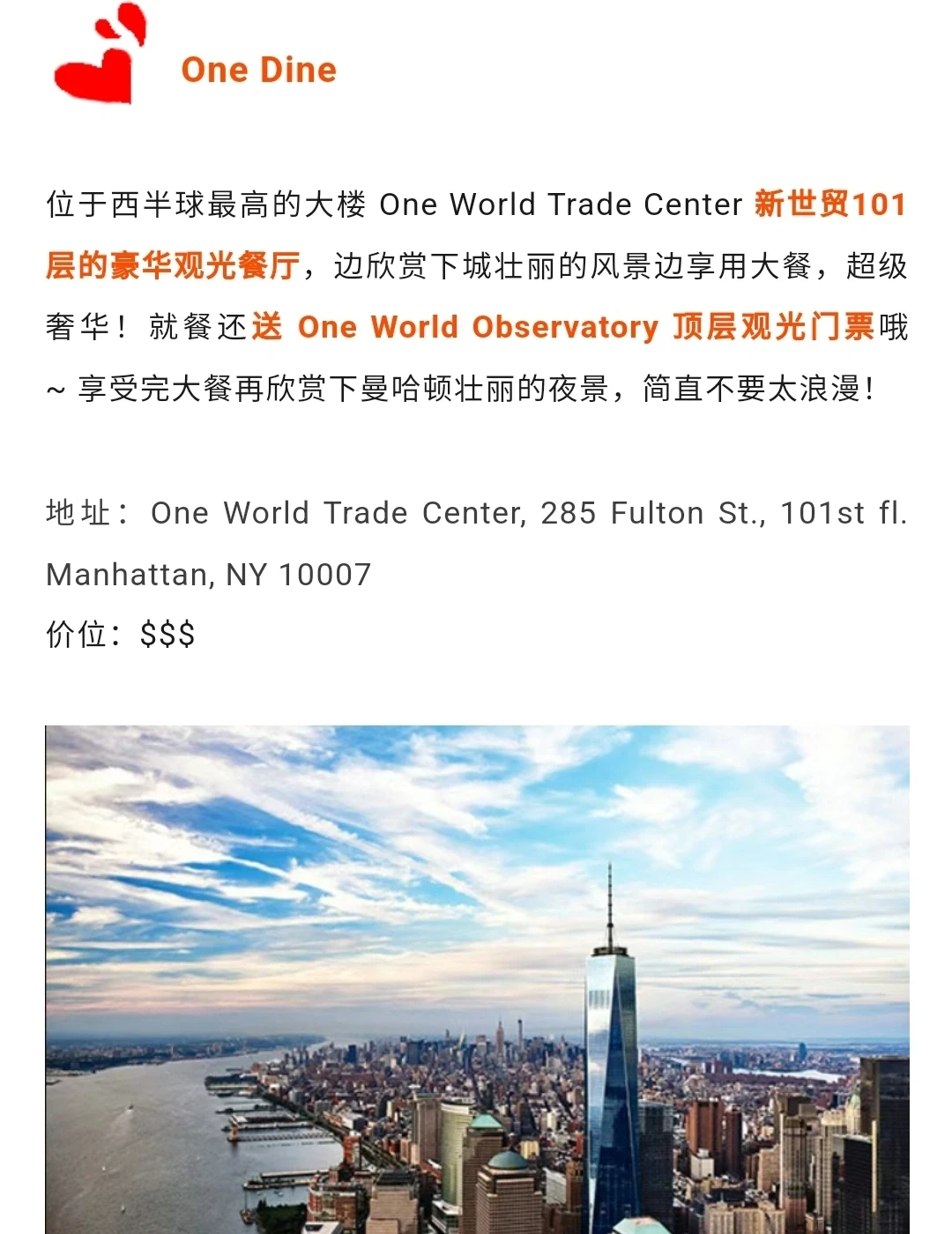 位于西半球zui高的大楼 One World Trade Center 新世贸101层的豪华观光餐厅,边欣赏下城壮丽的风景边享用大餐,超级奢华!就餐还送顶层观光门票