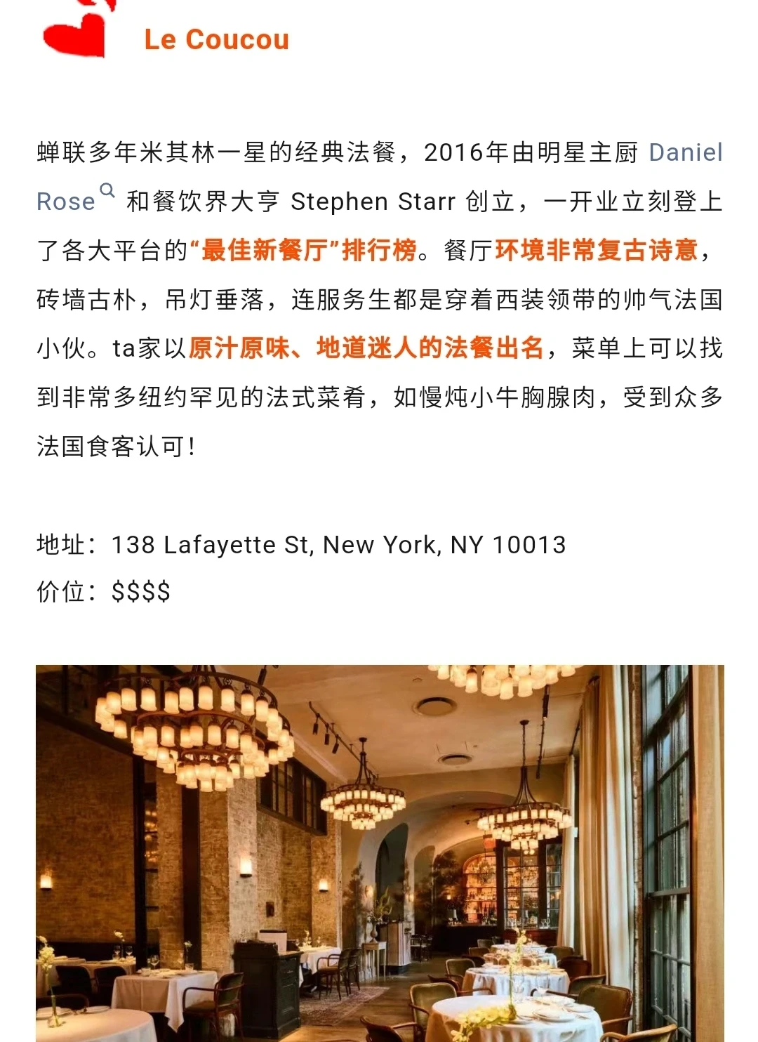 蝉联多年米其林一星的经典法餐,由明星主厨 Daniel Rose 创立,环境非常复古诗意,砖墙古朴,吊灯垂落,连服务生都是穿着西装领带的帅气法国小伙,以原汁原味、地道迷人的法餐出名