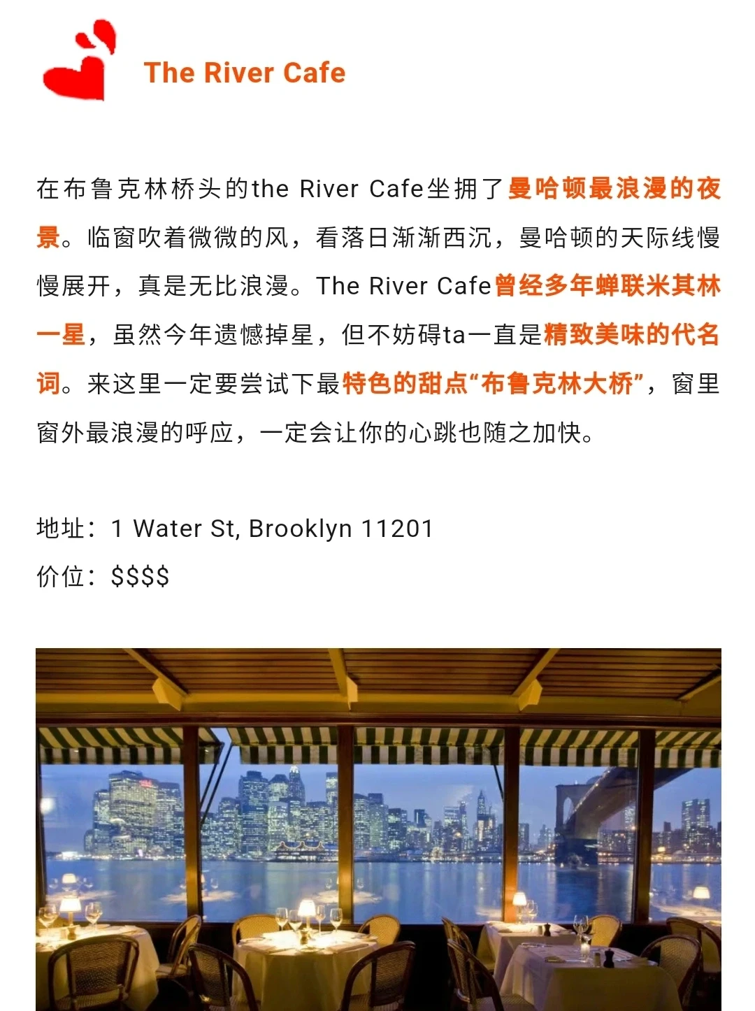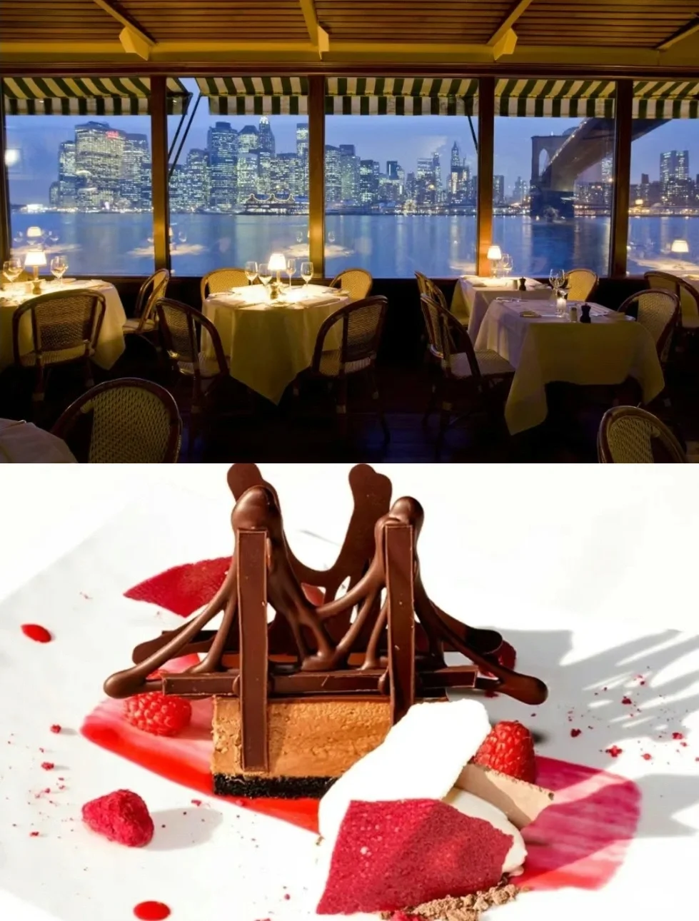 在布鲁克林桥头,坐拥了曼哈顿最浪漫的夜景,曾多年蝉联米其林一星,一直是精致美味的代名词。来这里一定要尝试下最特色的甜点“布鲁克林大桥”