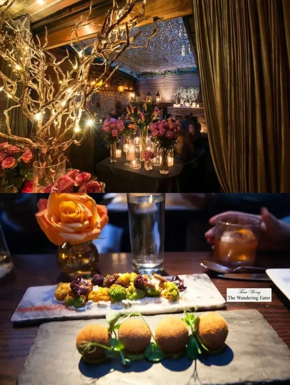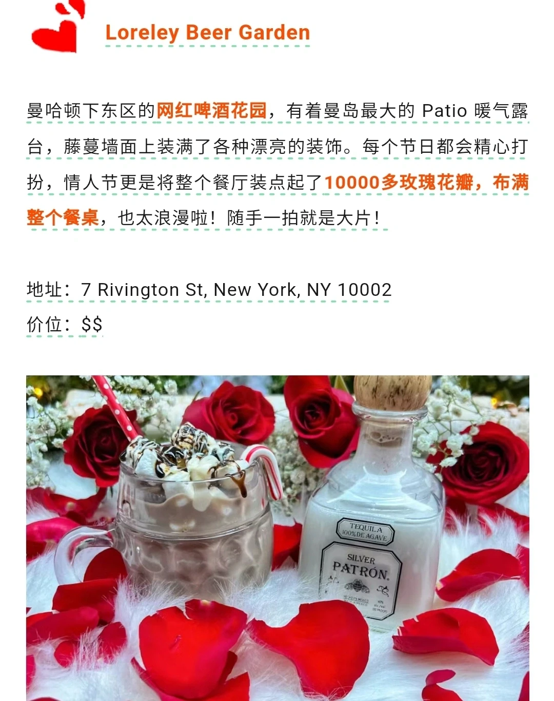 曼哈顿下东区的网红啤酒花园,情人节装点起了10000多玫瑰花瓣,布满整个餐桌,太浪漫啦