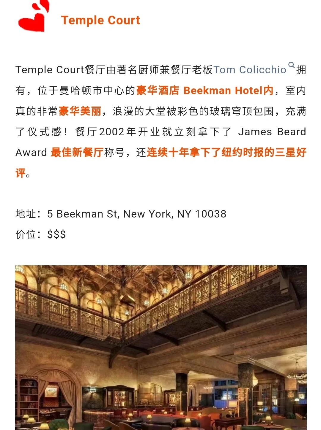 位于豪华酒店 Beekman Hotel内,室内非常美丽,浪漫的大堂被彩色的玻璃穹顶包围,充满了仪式感!2002年开业就立刻拿下了 James Beard Award 最 佳新餐厅称号