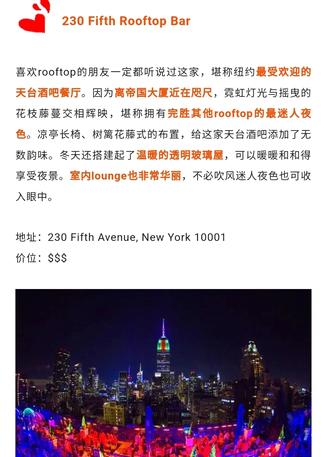 纽约zui受 欢 迎的天台酒吧餐厅之一,离帝国大厦近在咫尺,霓虹灯光与摇曳的花枝藤蔓交相辉映,堪称拥有完胜其他天台酒吧的迷人夜色