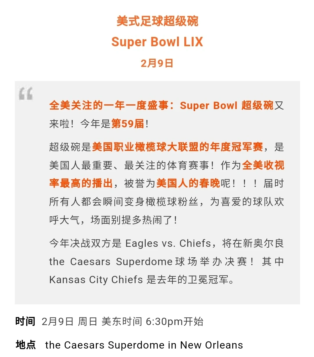 3️⃣美式足球超级碗 Super Bowl LIX 2月9日