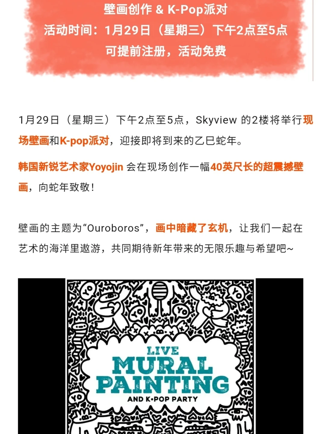 🔥 1月29日(星期三)下午2点至5点,韩国新锐艺术家 Yoyojin 会在现场创作一幅40英尺长的超震撼壁画,供大家欣赏!