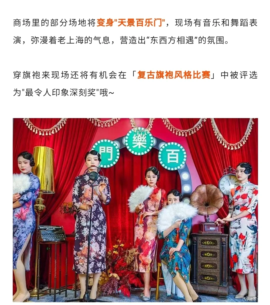 现场有音乐、有舞蹈表演,处处弥漫着老上海的气息,穿旗袍来现场还将有机会在「复古旗袍风格比赛」中被评选为"令人印象深刻奖"哦~💃💃💃