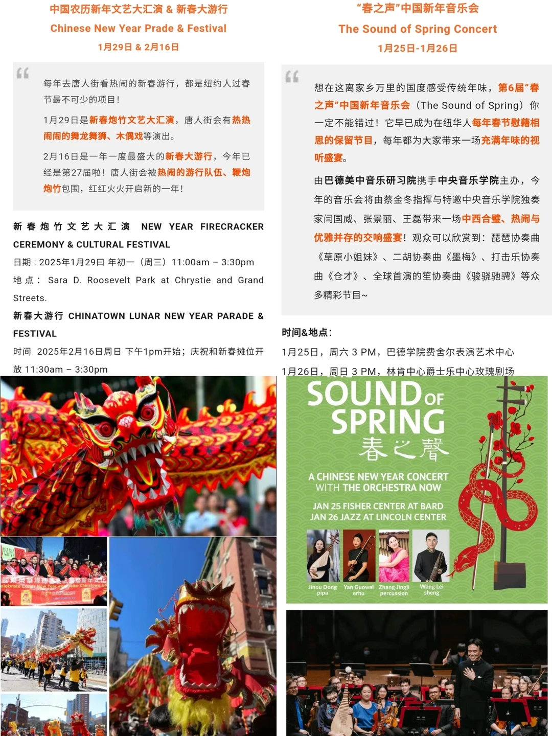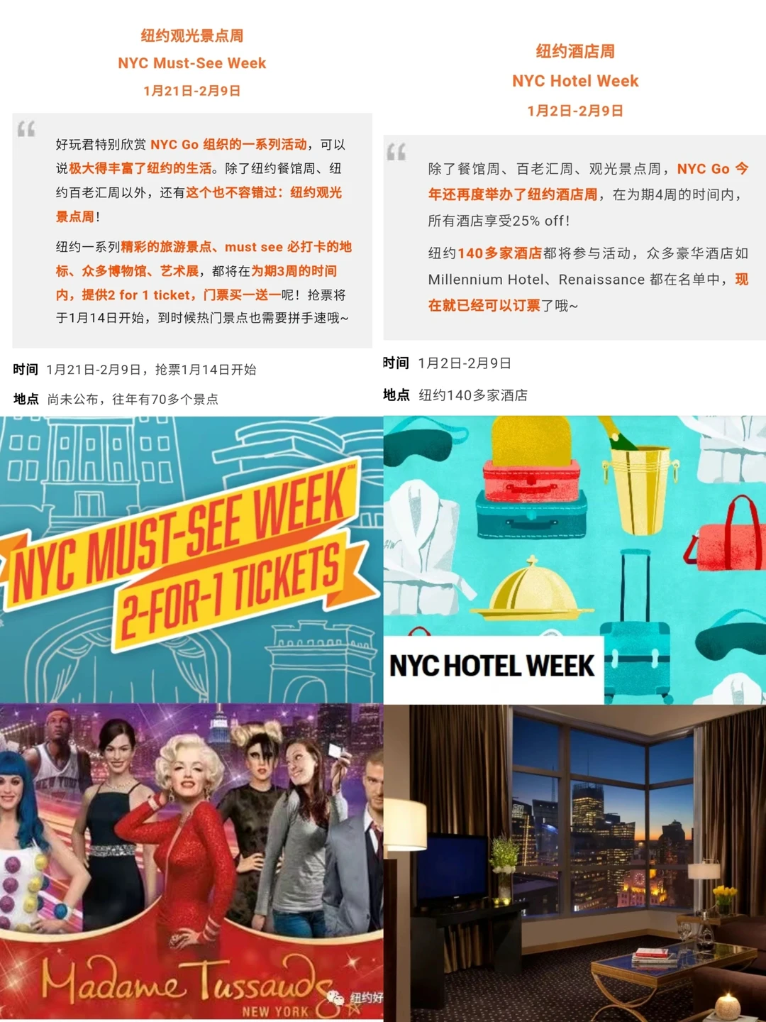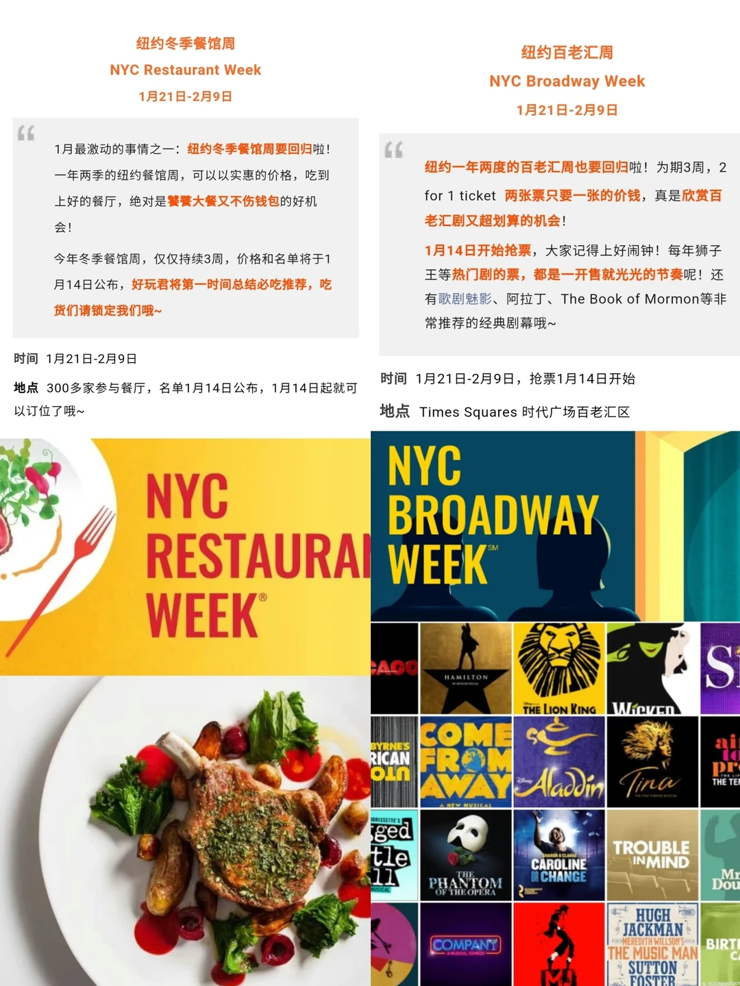 新的一年纽约依旧精彩纷呈,纽约餐馆周、百老汇周、观光景点周都回归啦,而且龙年也很近了,大年初一就在1月29日周三,除夕就在1月28日周二哦~