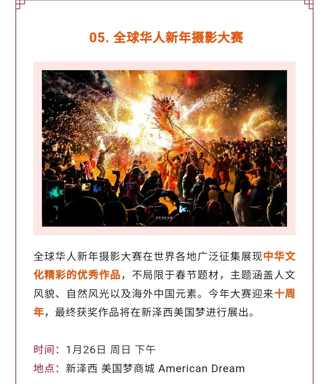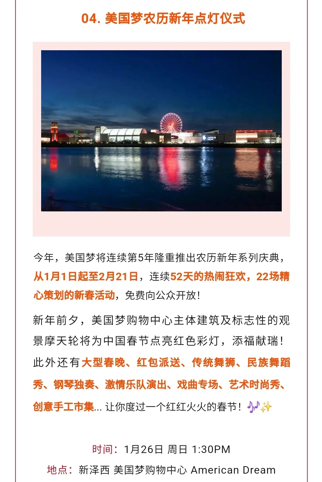 从1月1日起至2月21日,美国梦还有22场精心策划的新春活动,免费向公众开放!包括大型春晚、民族舞蹈秀、钢琴独奏、激情乐队演出、戏曲专场...