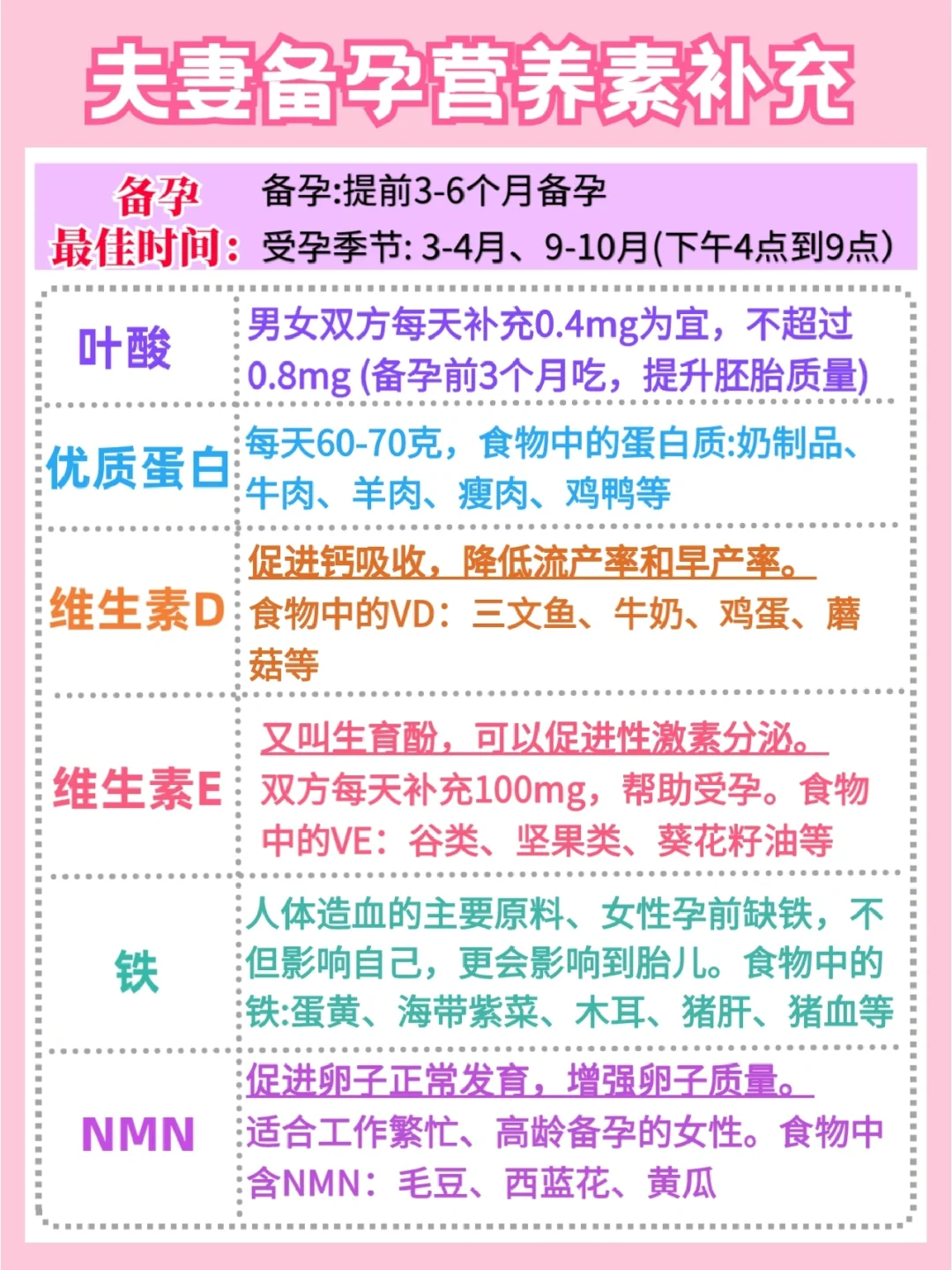 🔹1.叶酸:夫妻双方提前3个月服用,预防神经管缺陷,防止胎儿畸形。