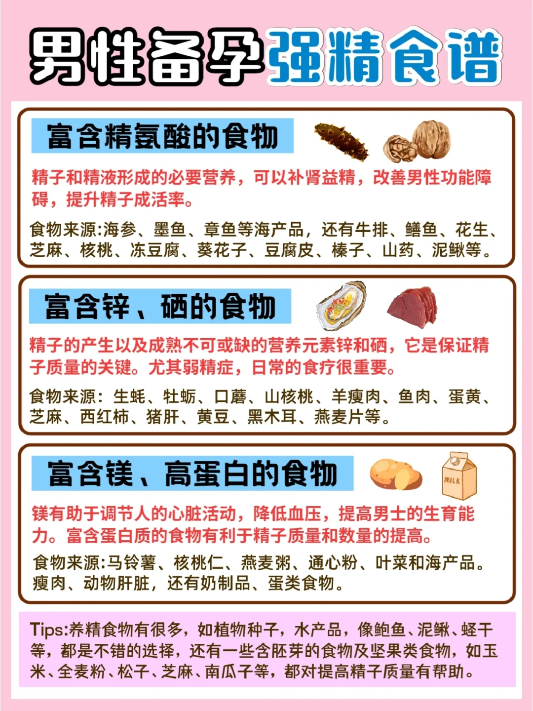 🔹6.精子:多吃富含锌、精氨酸的食物。