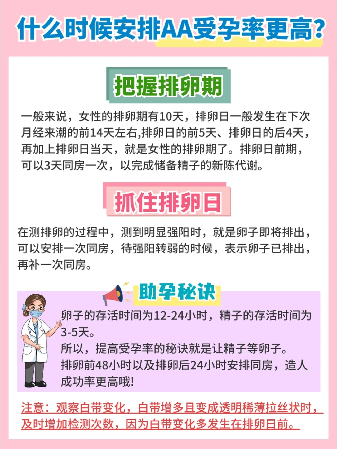 对例假规律的女性来说,排卵日通常是下次例假来临前14天,排卵日当天和排卵日前2日,受孕几率更高。