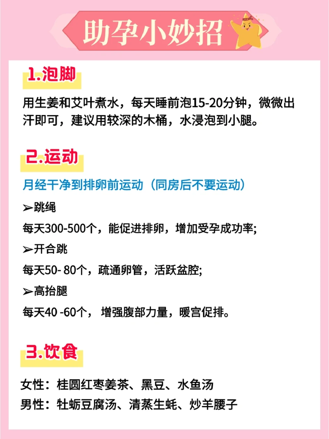 从经期开始,量少宫寒的,可以喝桂圆红枣姜茶直到经期结束,→ 月经结束后可以连续吃6天黑豆,测到排卵后就不吃,→月经结束5天后,可以吃一次水鱼汤,→月经结束每天跳绳200-300下,排卵后不跳,→排卵日前两天和当天安排同房。