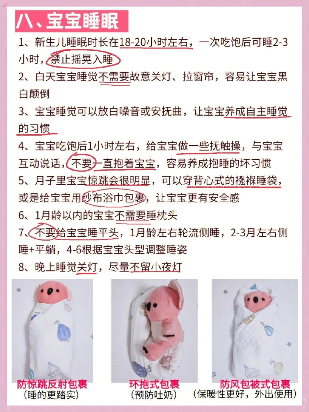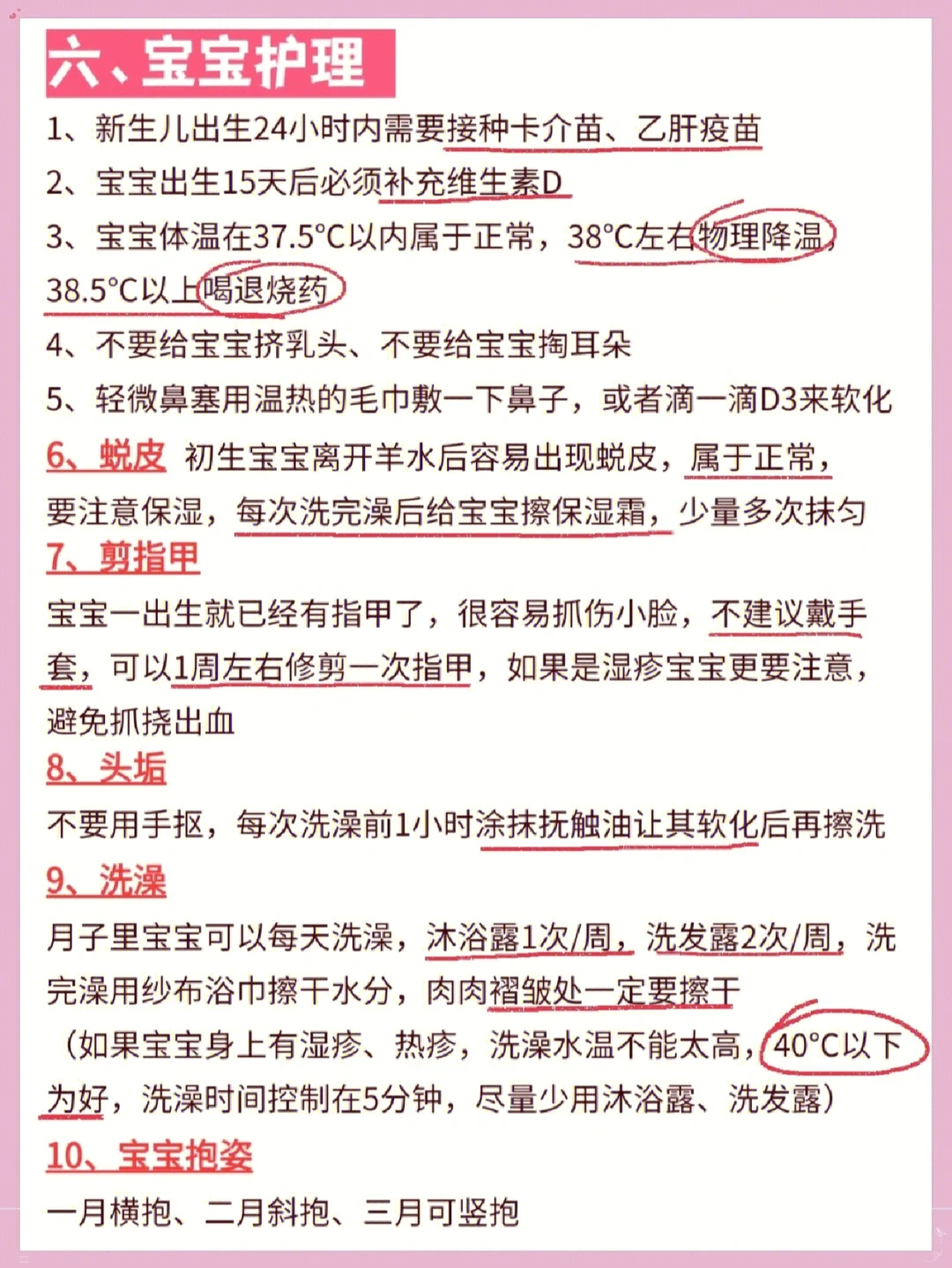 1️⃣宝宝刚出生,身体软软的,不能像抱大孩子一样,随意地抱起来,要保护好宝宝的颈部、腰部。尤其是宝宝的颈部,宝宝的头比较重,如果不护住颈部,头部自然下垂会损伤颈椎。
