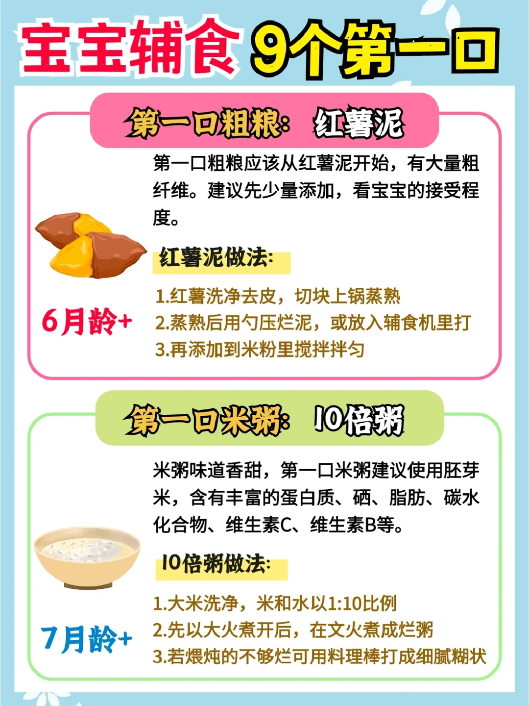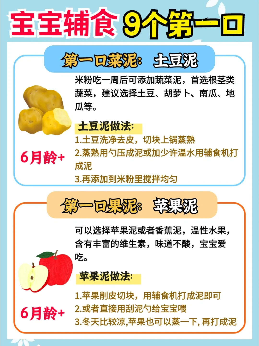 ✨6个月:第①口高铁米粉、核桃油、土豆泥、苹果泥、红薯泥