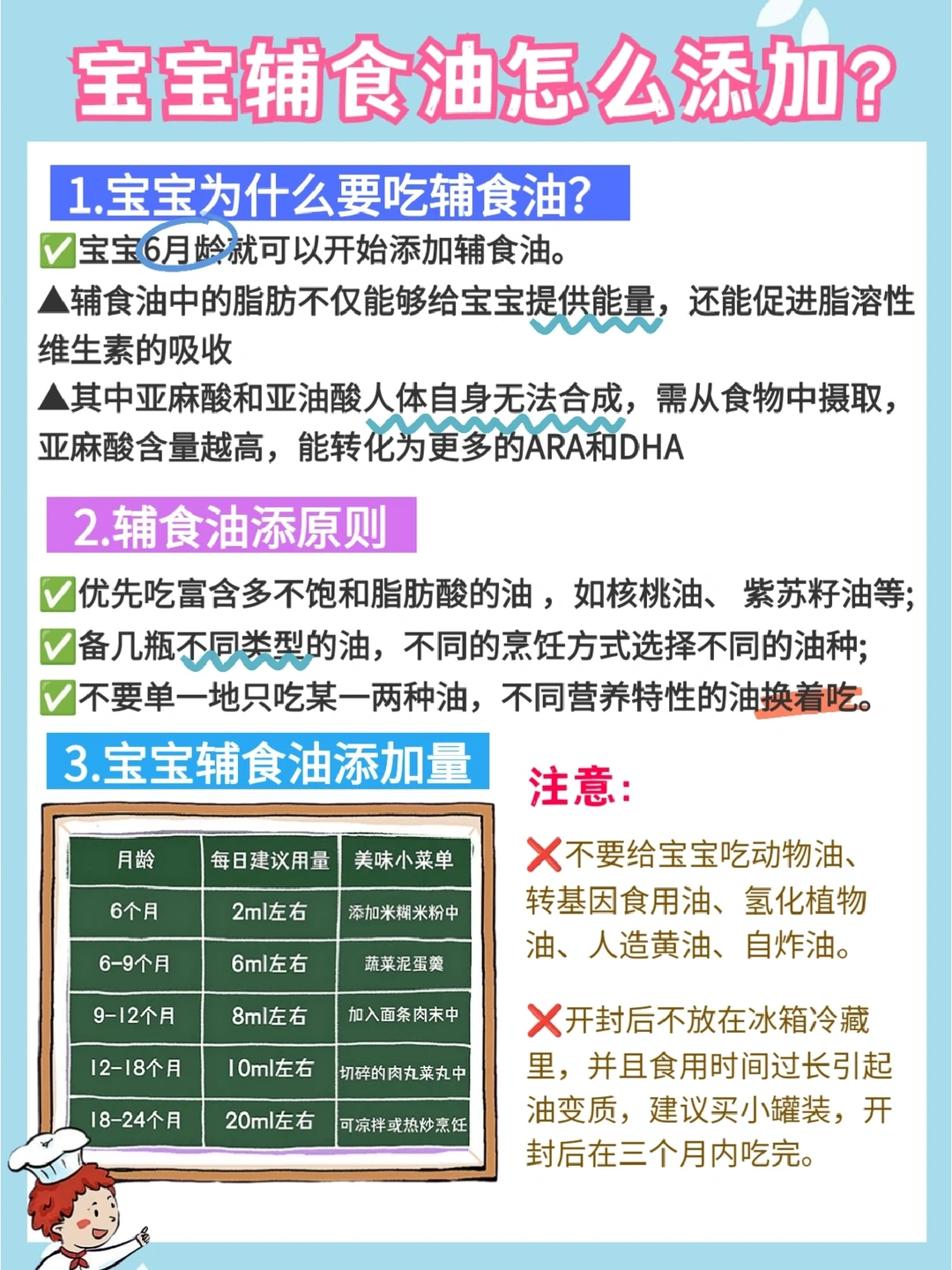 辅食油可以为宝宝提供人体必需脂肪酸,如亚油酸和亚麻酸,这些都是人体无法自身合成的脂肪酸,必须通过食物获取。