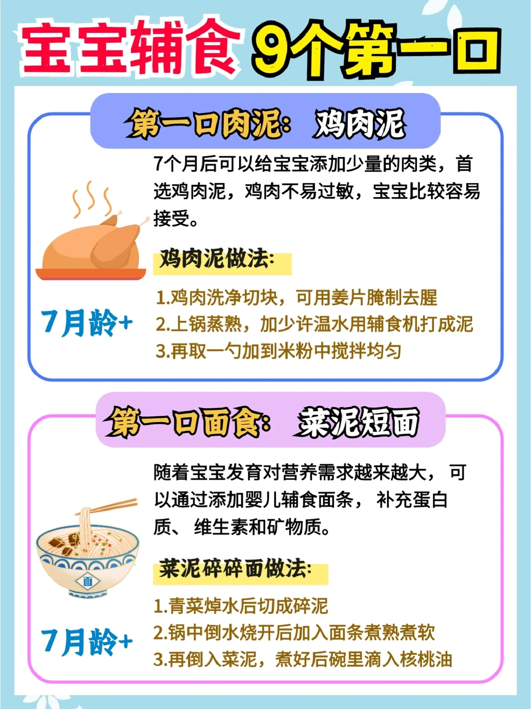 ✨7~9个月:十倍粥、短面、1/4蛋黄、🐔肉泥、鳕鱼泥、猪肉泥