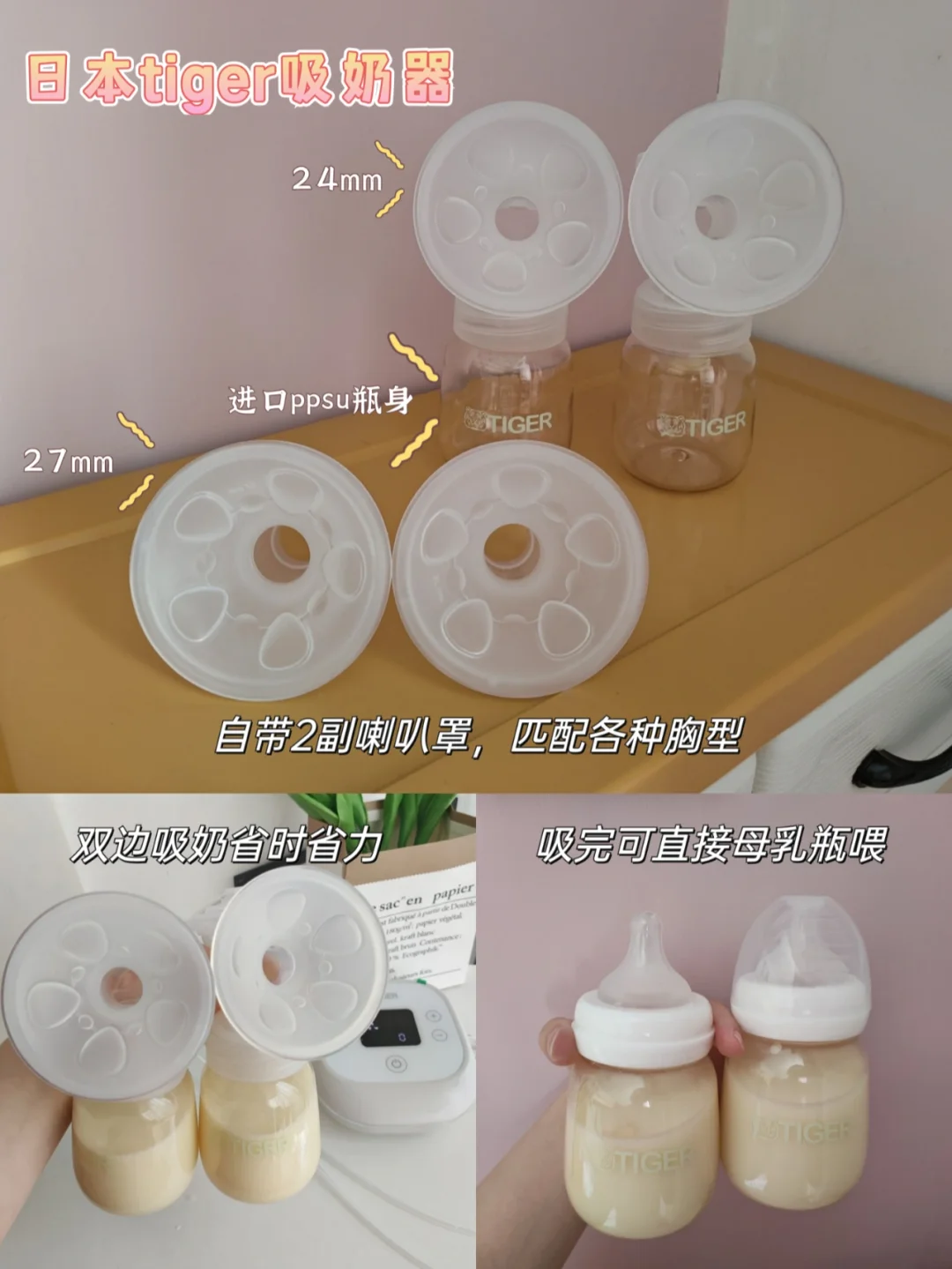 我产后用的是日本虎牌tiger吸奶器,妈妈群里好多人在用的,模拟婴儿吸吮触感,升级的双核电机,吸乳效率大大提高,每个模式都有10个档位可调节,可以适应大部分的哺乳妈妈,吸奶一点也不会痛。特别值得一提的是,这个超级舒服的硅胶花瓣喇叭罩配备了两种尺寸,可以随着胸部的大小自由更换,再也不用担心喇叭罩大小不适了。还不知道怎么选吸奶器的麻麻们,放心入吧!